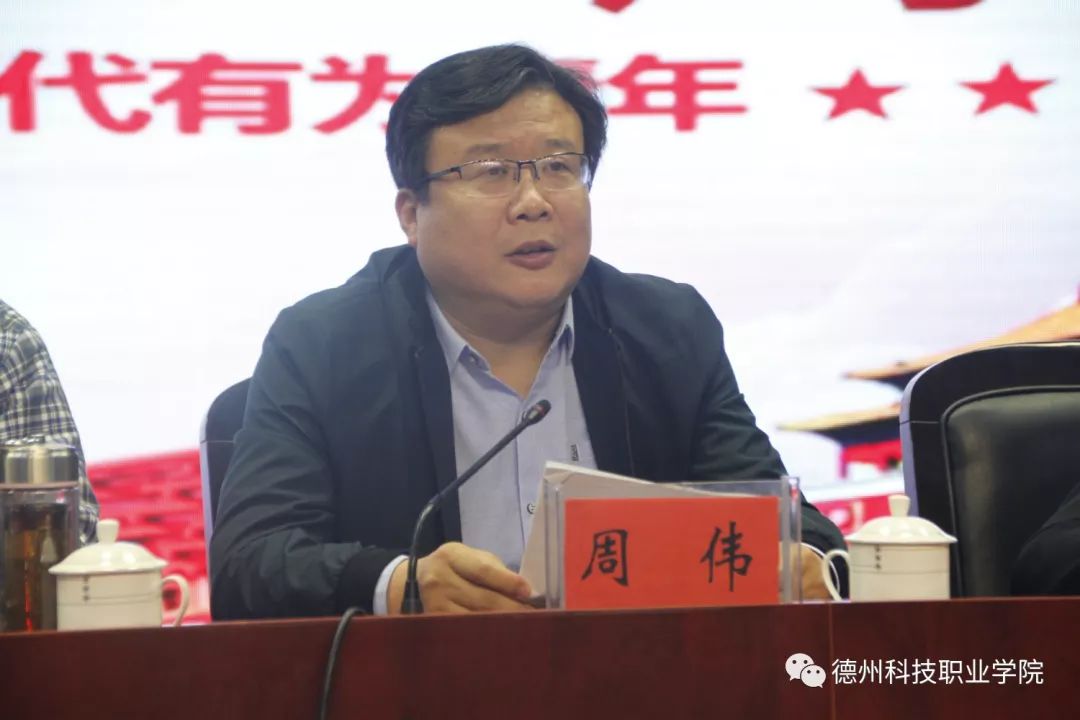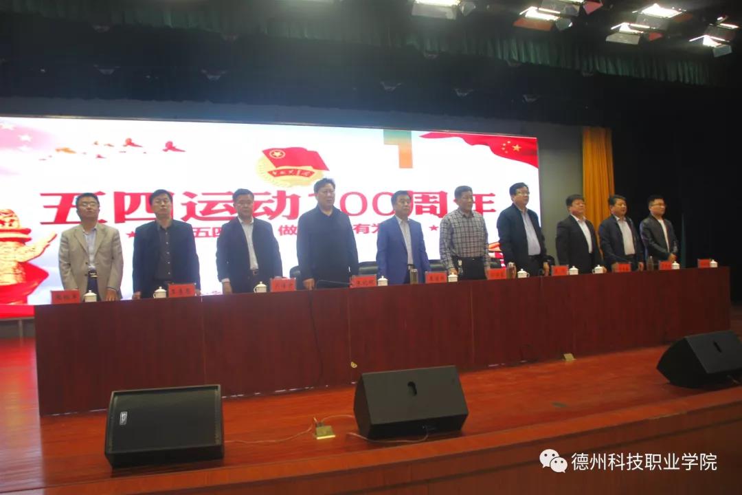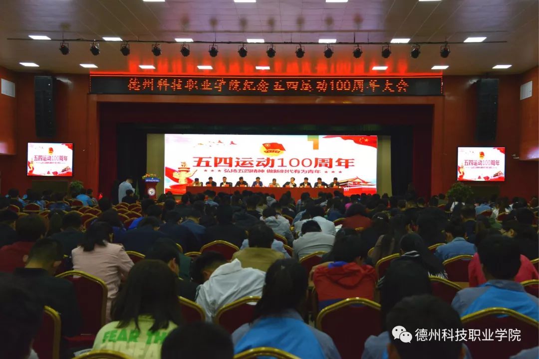5月7日下午,德州科技职业学院纪念五四运动100周年大会在大禹大讲堂召开,学院党委书记展德明出席会议并作重要讲话。学院领导孙京家、朱纪辉、周伟、卢传升、时来春、王来恩、吴志刚、张祖军,主校区团委书记孙强强等在主席台就坐。学院全体教职员工、各院系青年团员学生代表参加大会。