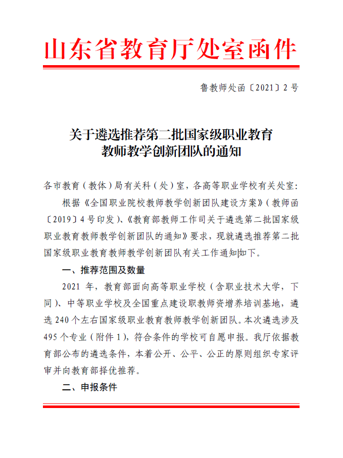 关于遴选推荐第二批国家级职业教育教师教学创新团队的通知