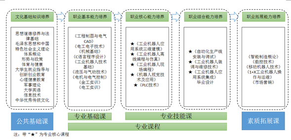 综合分析岗位典型工作任务对工作过程的要求,把工业机器人技术专业的专业能力培养分解为工业机器人操作能力、应用编程能力和调试维修能力三条主线,并分别经过技术基础能力、核心专业能力、综合专业能力、拓展专业能力四个专业能力学习阶段的培养,达到企业“准员工”对基本专业能力的要求,完成对学生企业“准员工”培养,同时兼顾学生职业发展必需的基础知识和技能的学习与培养,并通过第五阶段岗位工作能力培养——在顶岗实习中完成企业实际生产任务的作业,完成岗位工作能力的培养,实现由“企业准员工”到社会“职业工作者”的转变,达到专业人才培养目标。