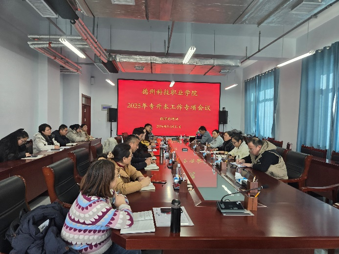 教学科研部于2024年12月11日在德州校区会议室召开2025年专升本工作专项会议,会议由教学科研部谢艳春部长主持,于秀妮副部长、各二级学院院长、办公室主任、学生科长参加会议。