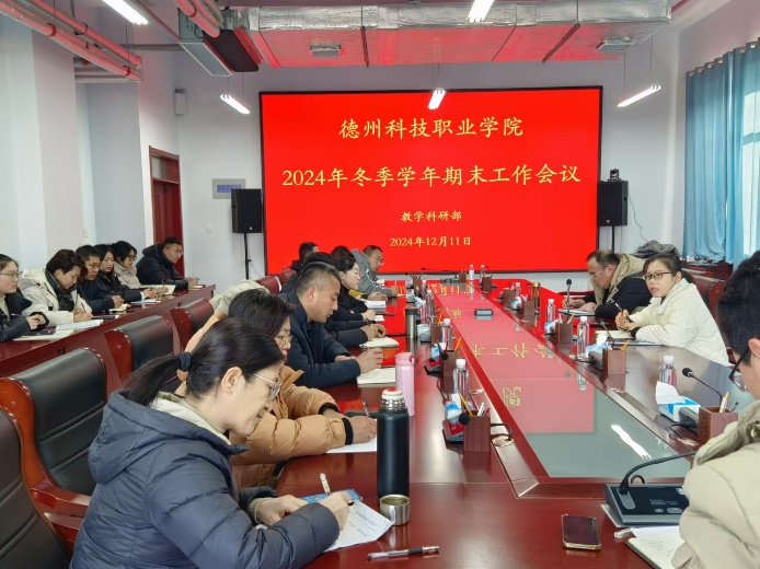 2024年12月11日教学科研部在德州校区6楼会议室召开2024冬季学年期末工作会议,会议由教学科研部副部长于秀妮主持,教学科、各二级学院办公室主任、成绩管理员相关人员参加会议。