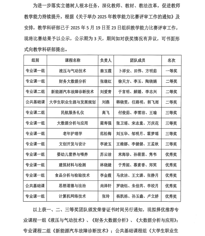 德州科技职业学院2025年教学能力比赛结果公示