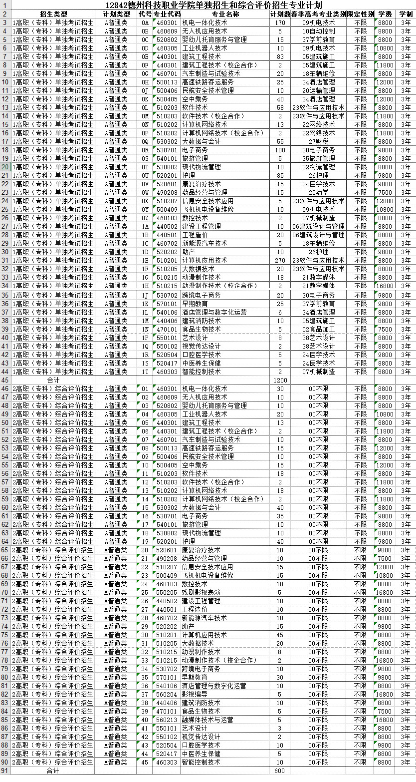 2022年德州科技职业学院单独招生和综合评价招生专业计划