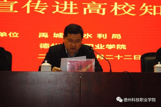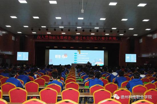 为大力宣传保护水资源的重要性,增强学生水资源保护意识,3月22日下午,德州科技职业学院主校区在大禹大讲堂开展“3.22世界水日 中国水周”宣传活动,举办节水知识宣传讲座。禹城市水利局局长孙建勇,学院党委副书记、副院长、主校区党总支书记、院长朱纪辉出席活动。禹城市水利局副局长赵秀兰主持活动。