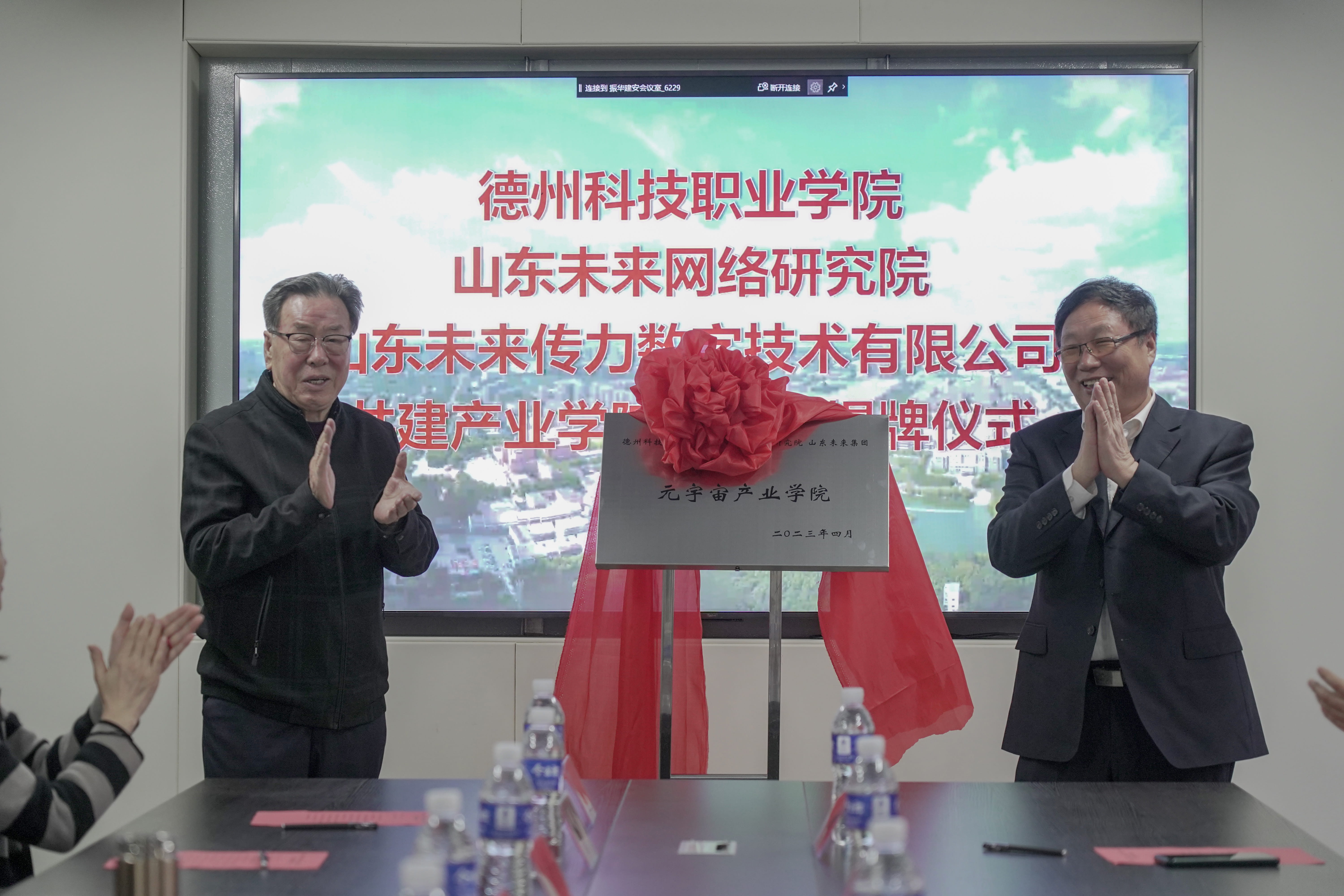朱国材、李树军为德州科技职业学院、山东未来网络研究院、山东未来集团共建的“元宇宙产业学院”揭牌。