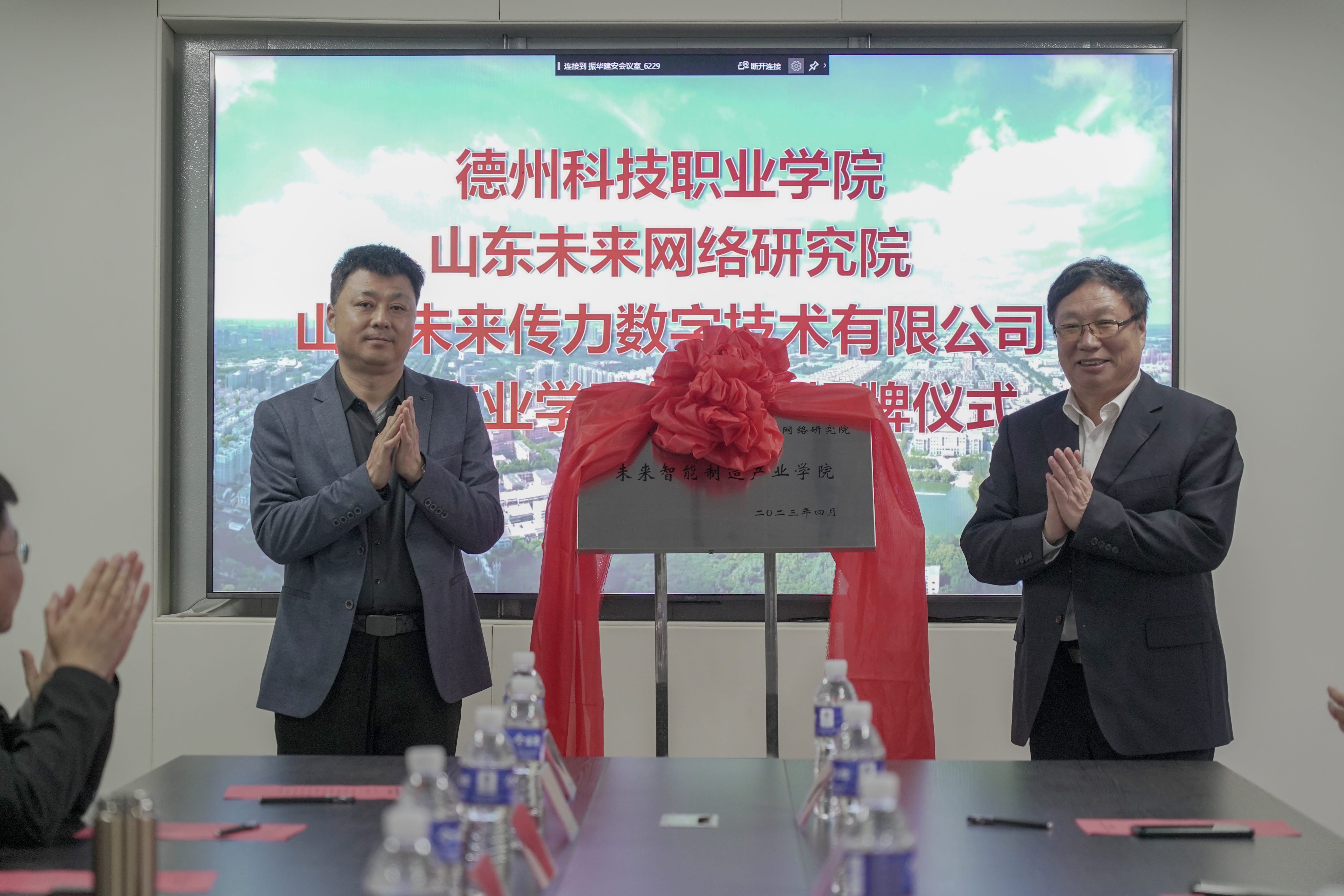 申毅、李树军为德州科技职业学院、山东未来网络研究院共建的“未来智能制造产业学院”揭牌。