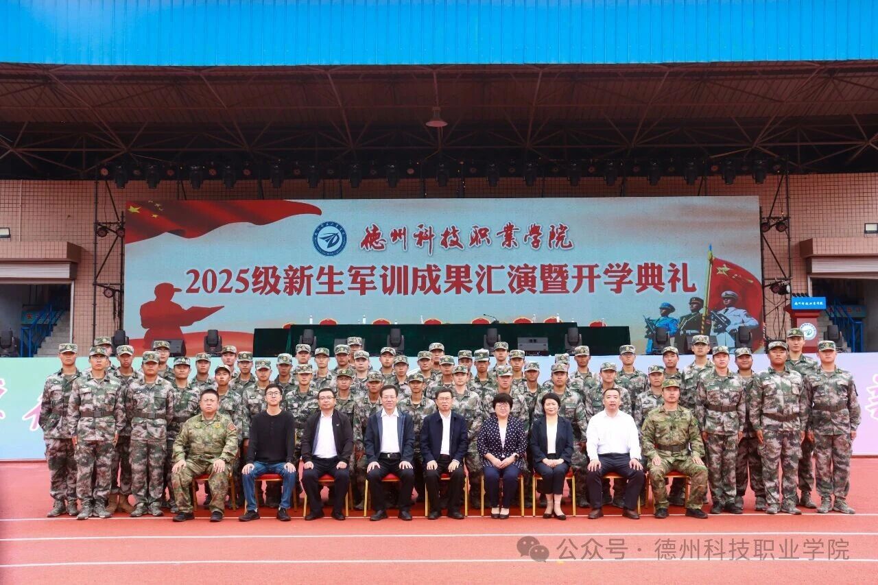 2025级新生军训成果汇演暨开学典礼结束后,全体出席人员与承训教官合影留念。