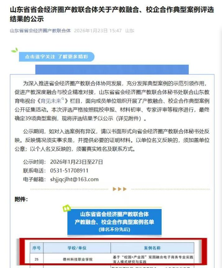 近日,山东省省会经济圈产教联合体公布产教融合、校企合作典型案例评选结果,我院张继红院长牵头完成的《基于“校园+产业园”双园融合电子商务专业实践育人模式研究与实践》成功入选。这一成果的落地与获评,既是我院在产教融合育人体系构建与实践创新领域深耕细作的重要体现,更彰显了学院在相关研究与教学实践中的扎实功底。