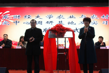 山东省农业与农村经济研究中心主任王蔚(图左)和禹城市副市长司红玉(图右)为山东财经大学农业与农村经济研究中心调研基地揭牌。