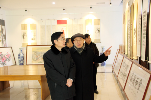 李玉梅一行先后到学院图书馆、校史馆,实地了解文化育人等方面工作开展情况。在校史馆学院创新发展成就展厅,李玉梅听取关于学院发展历程、办学理念等有关情况介绍,了解、察看学院多年办学过程中在教学、科研、文体活动中取得的各项荣誉和教学成果。在“全国名家书画作品展”展厅,李玉梅一行参观了全国书画名家的优秀作品,并听取学院关于传统文化进校园和 “禹龙博物馆”建设、运行等工作开展情况汇报。