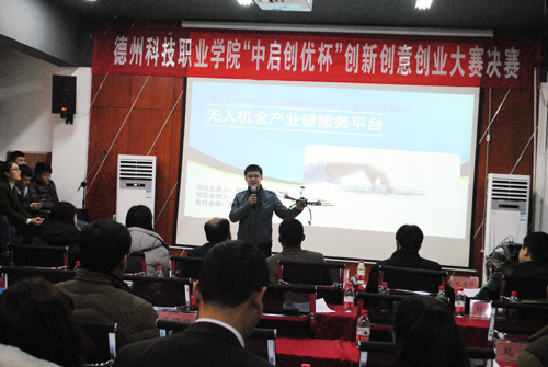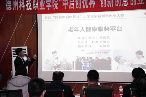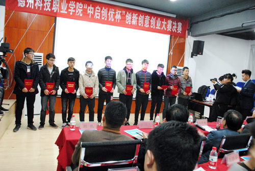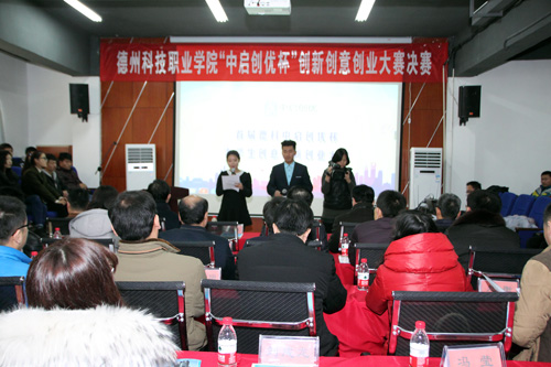 (记者 吕品)12月29日下午,由学院主办、北京中启创优教育科技有限公司禹城分公司承办的首届“中启创优杯”创新创意创业大赛决赛在禹城德科云众创举行。禹城市人大常委会副主任段昭基,市教育局局长张祖义,共青团禹城市委书记窦光斌,市高新区招商局局长毛成伟,市人力资源和社会保障局副局长张振江,科技局副局长王明安、赵林,禹城市总工会党组副书记李振刚,学院党委书记朱纪辉,副院长、主校区常务副院长周伟、主校区副院长王来恩等出席活动。