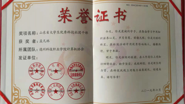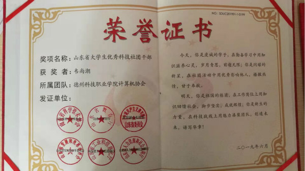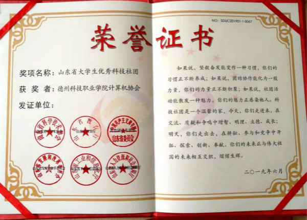 近日,德州科技职业学院主校区信息财经学院计算机协会荣获“山东省大学生优秀科技社团”称号,该社团继2012年后再次获得此殊荣。