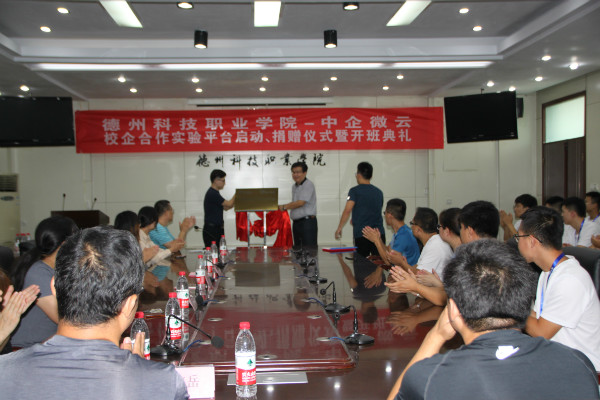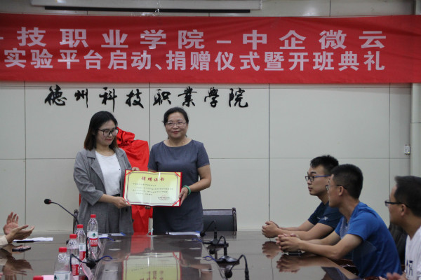 周伟与李国栋共同为“德州科技职业学院——中企微云产教融合深化工程试验平台”揭牌。