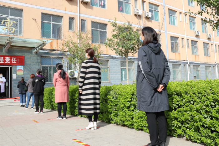 在教职工通道教职工分为驾车、骑行、步行入校,分别进行测温登记期间间隔2米,依次进入校园。