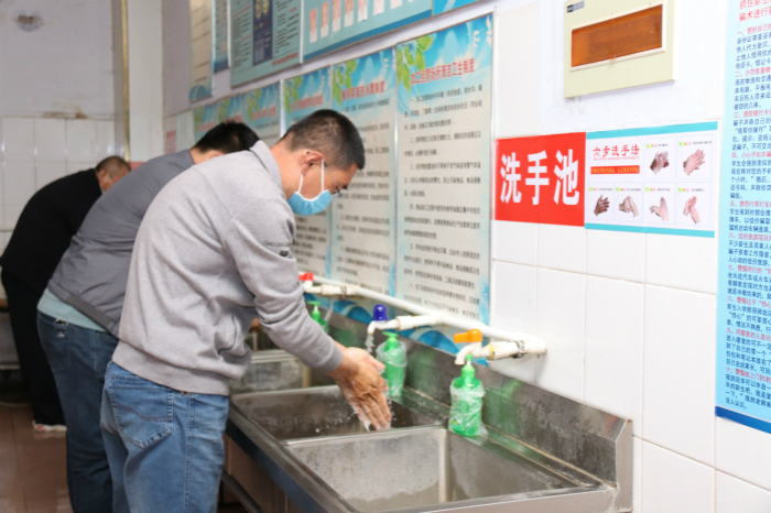 进入餐厅模拟 :19机电2班学生排队间隔1.5米在餐厅等候区等候,体温检测无异常后依次有序进入餐厅,按照七步洗手法洗手,洗手完毕后去各个窗口取餐,取餐后,在餐桌同向就餐,就餐过程中,不沟通、不交流,有秩序安静就餐。就餐结束后,将餐具放置指定位置,有序离开餐厅。