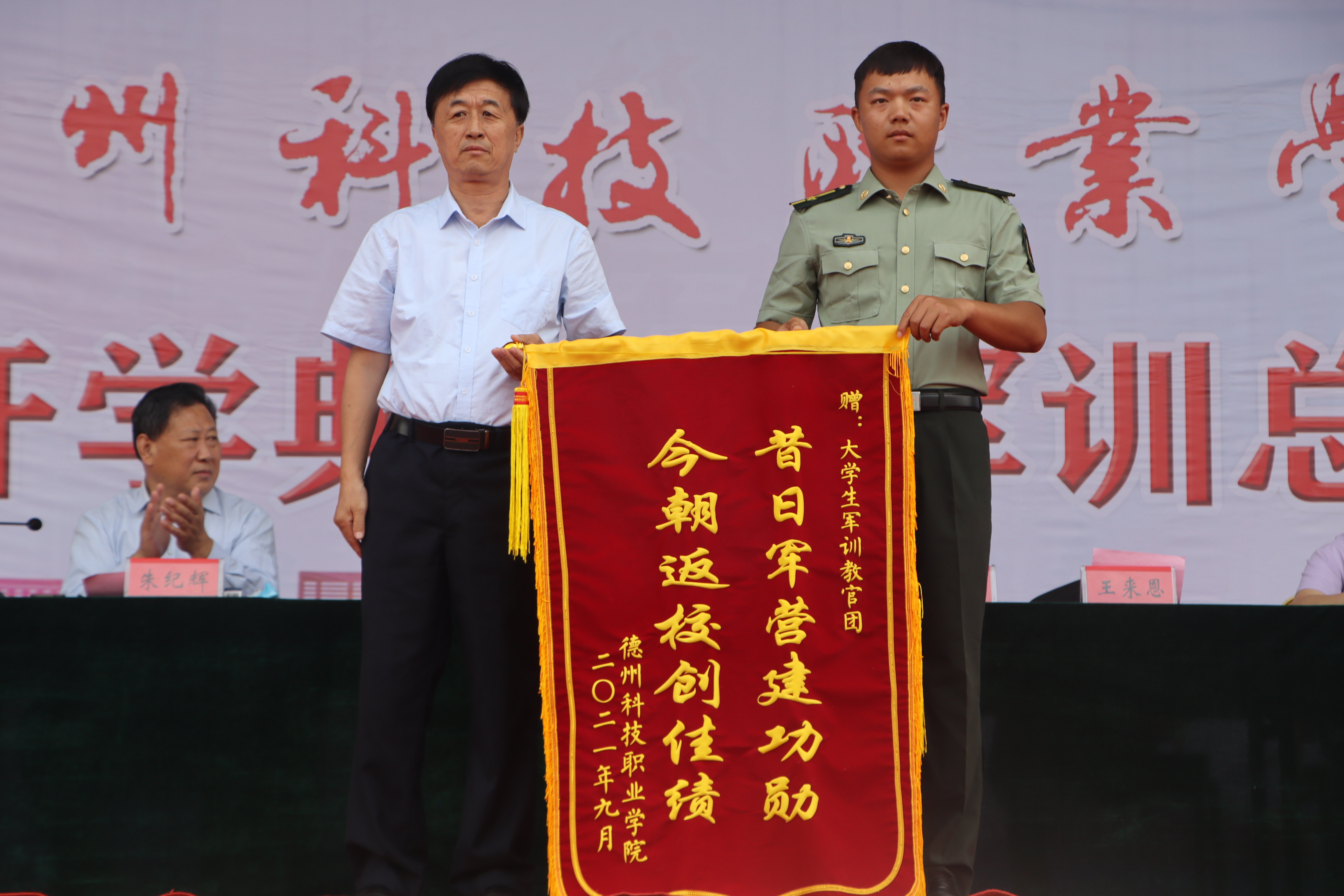 军训成果汇报结束后,军训团团长张旭年向孙京家交回军训团团旗;王来恩向军训教官团授锦旗。