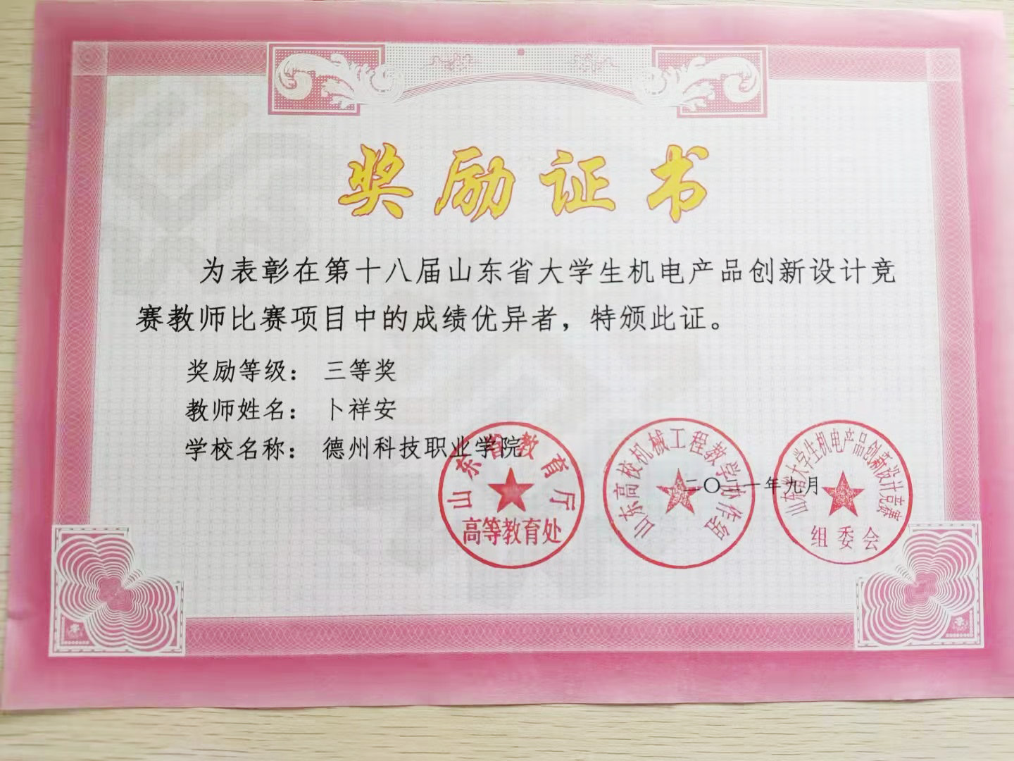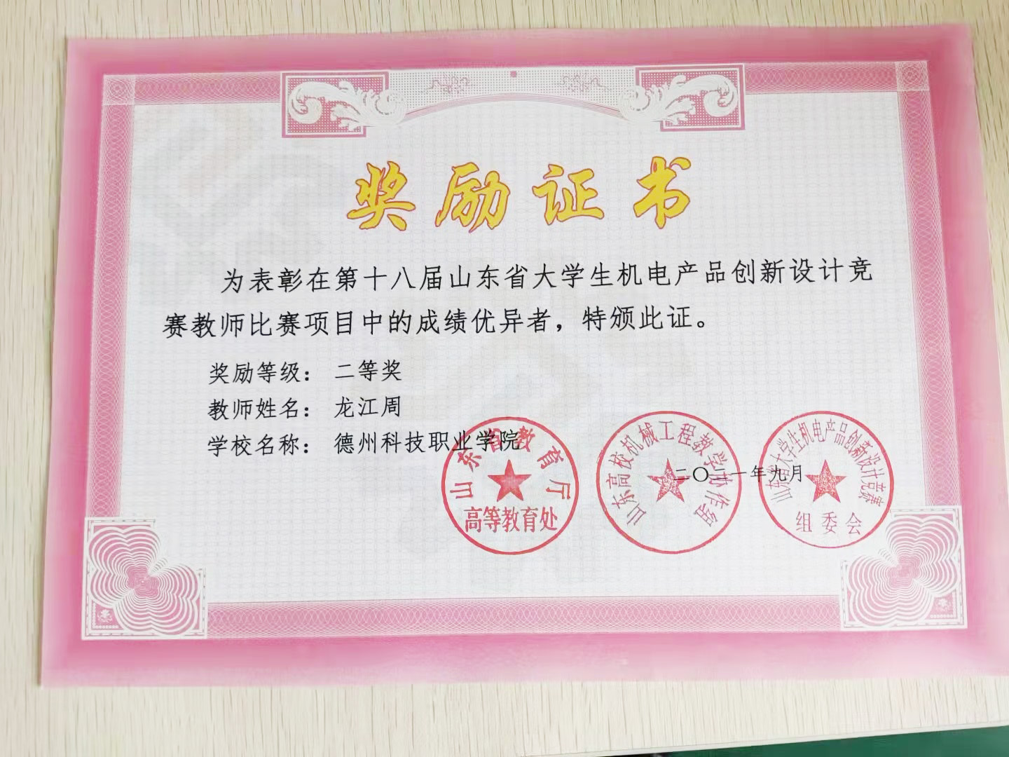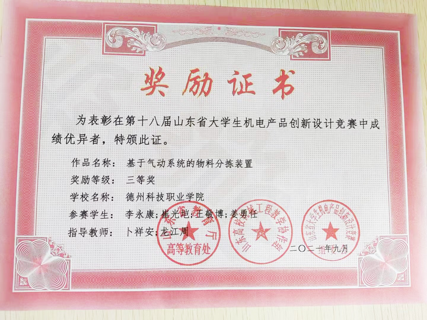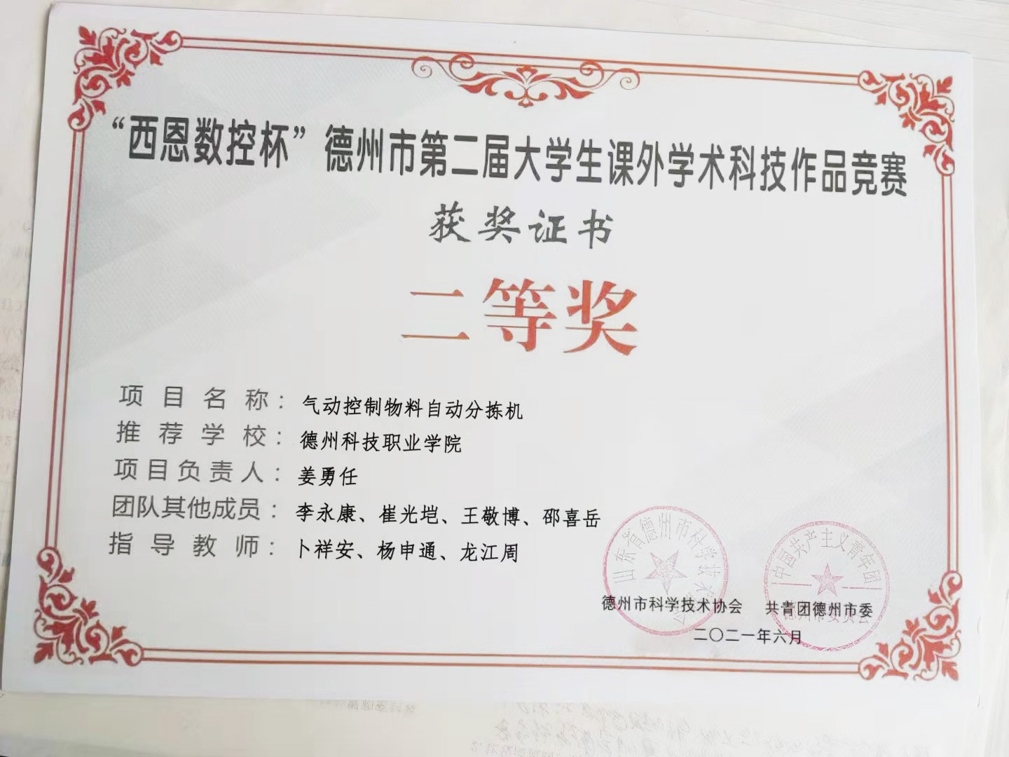 由姜勇任负责,卜祥安、杨申通、龙江周指导,学生李永康、崔光垲、王敬博、邵喜岳的参赛作品“气动控制物料自动分拣机”在“西恩数控杯”德州市第二届大学生课外学术科技作品竞赛中荣获二等奖,同时,该作品还获得了德州市市长杯工业设计大赛新星奖。