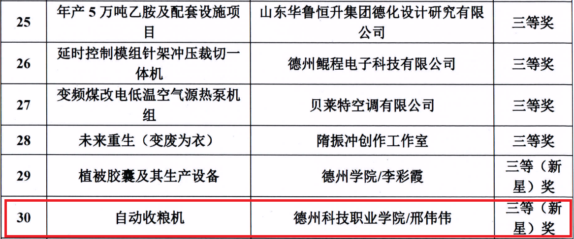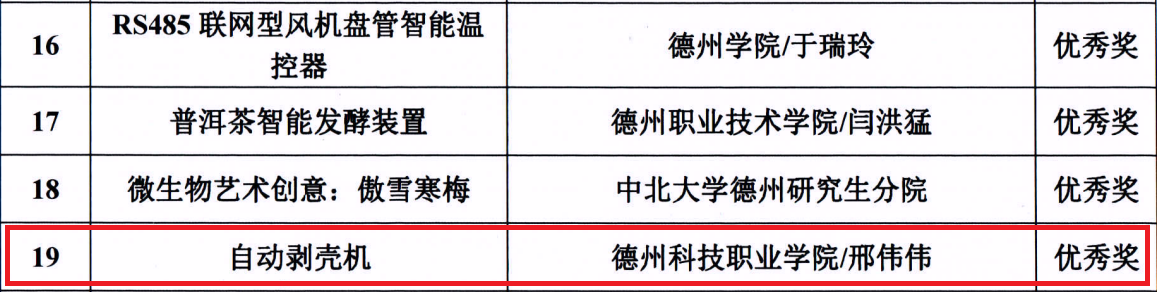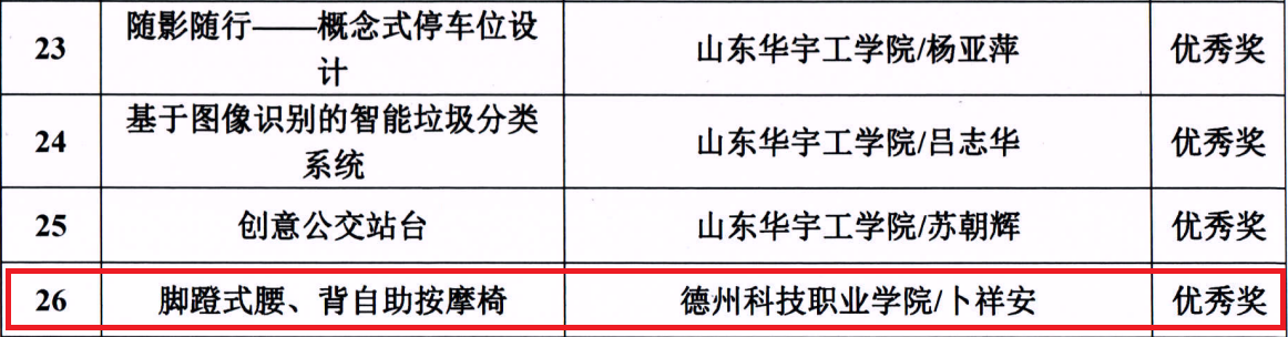 日前,德州“市长杯”工业设计大赛组委会印发通知,公布德州市首届“市长杯”工业设计大赛获奖名单。德州科技职业学院申报的《自动收粮机》荣获三等奖,申报的《自动剥壳机》和《脚蹬式腰、背自助按摩椅》获优秀奖。