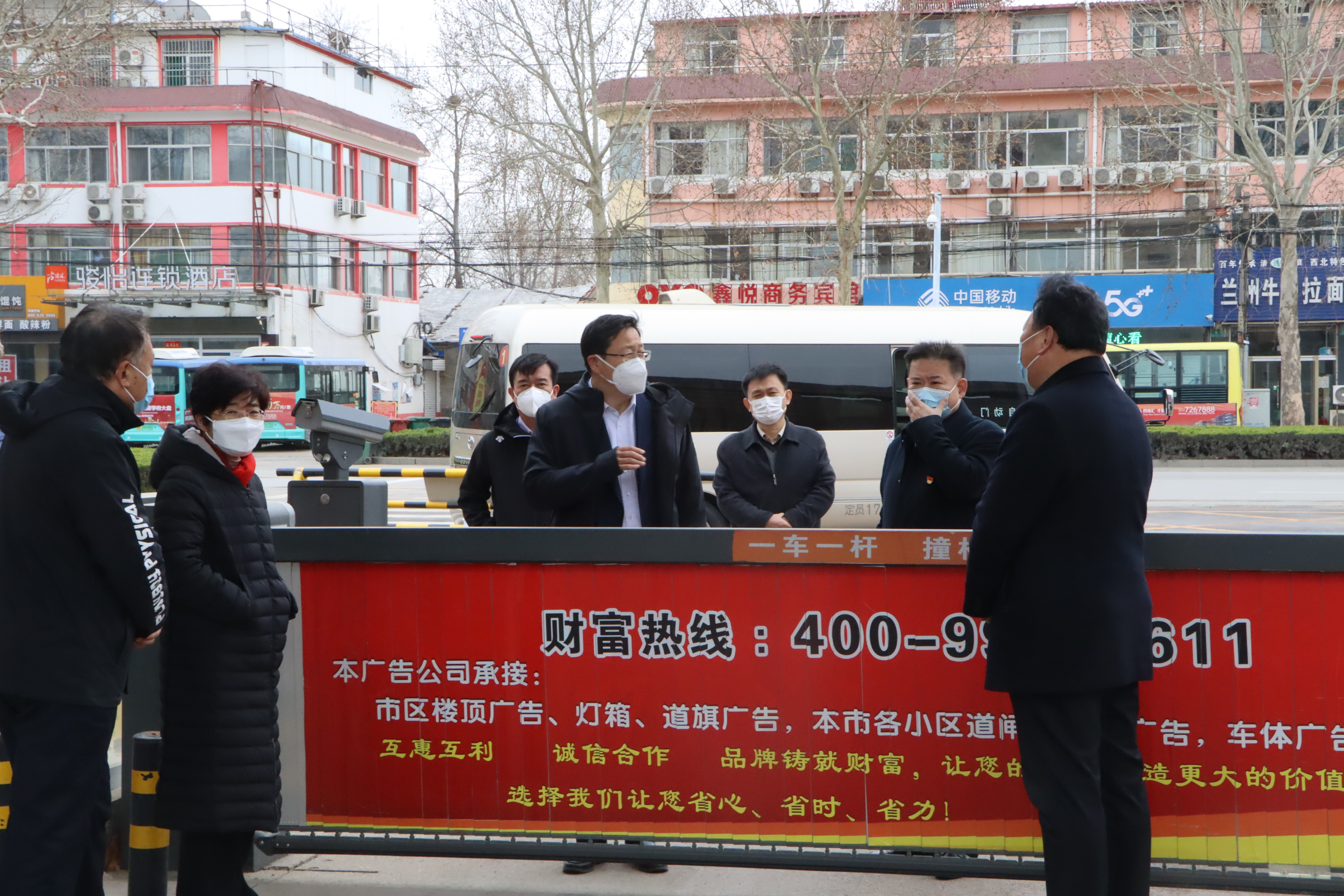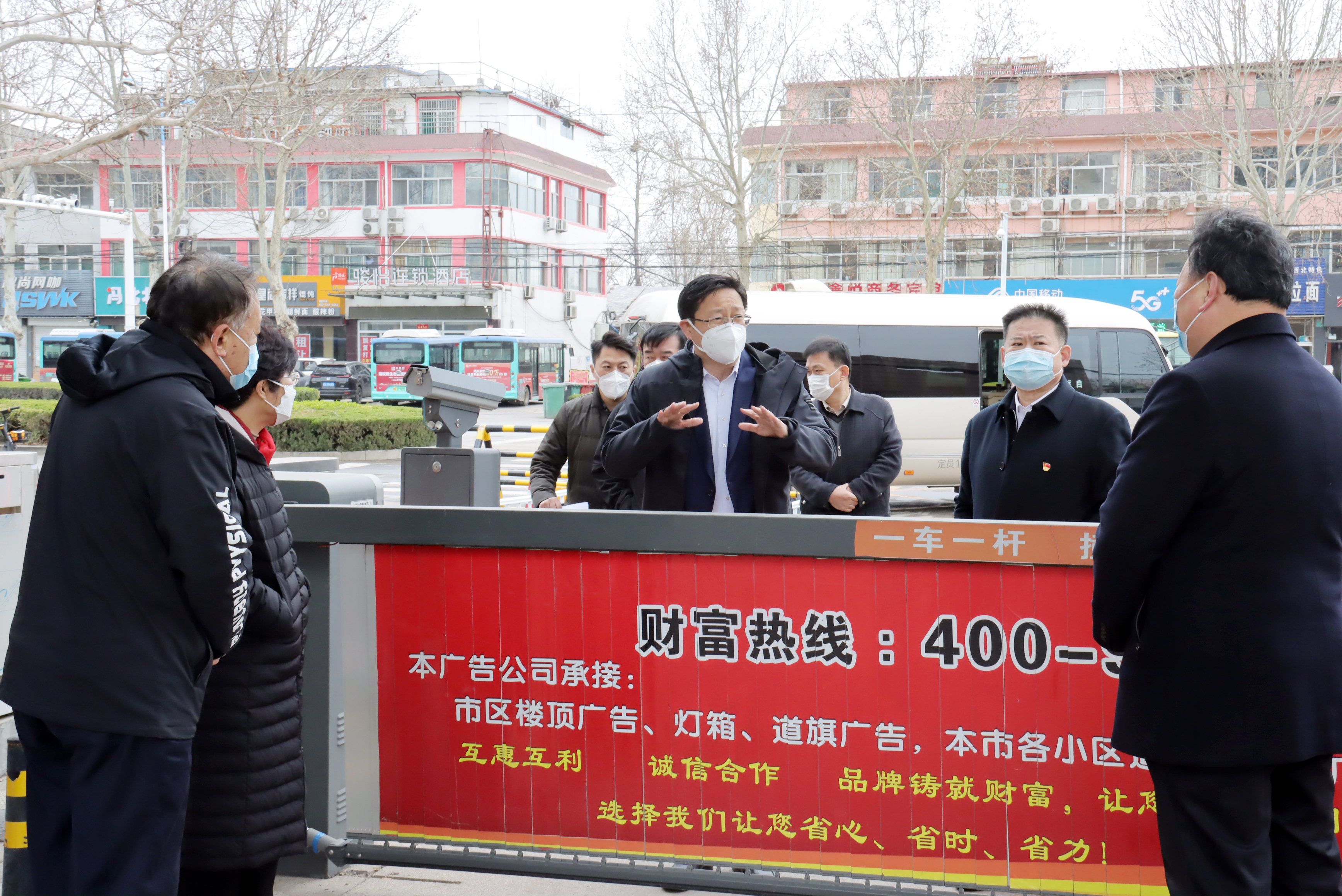 在学院校门口,宿胜听取了闫秀丽、刘开明、朱纪辉等关于校园全封闭管理、疫情防控、安全稳定等方面情况的汇报。朱纪辉就在校学生管理、后勤服务、环境消杀、线上教学工作等方面的开展与落实情况作了介绍。
