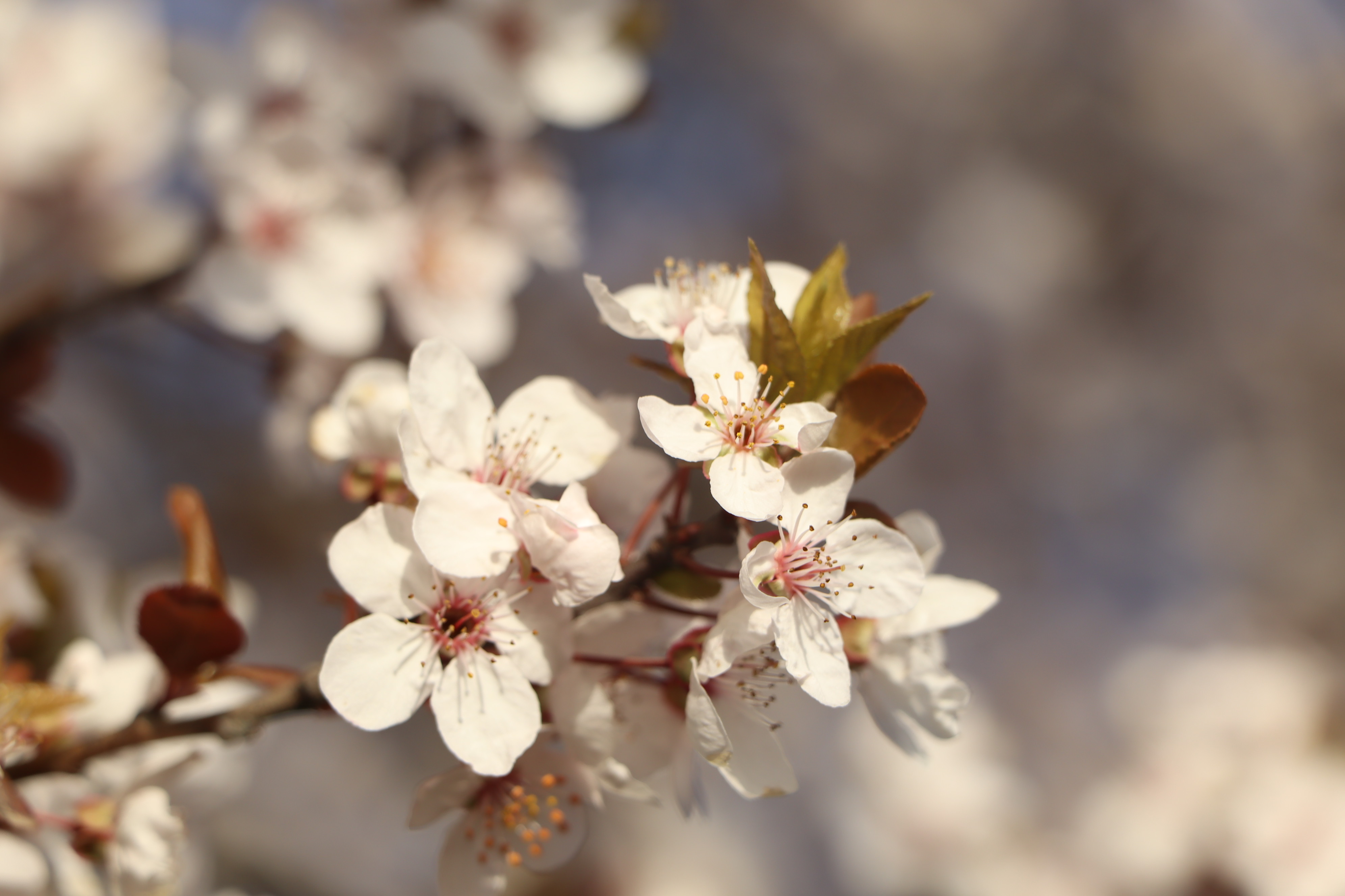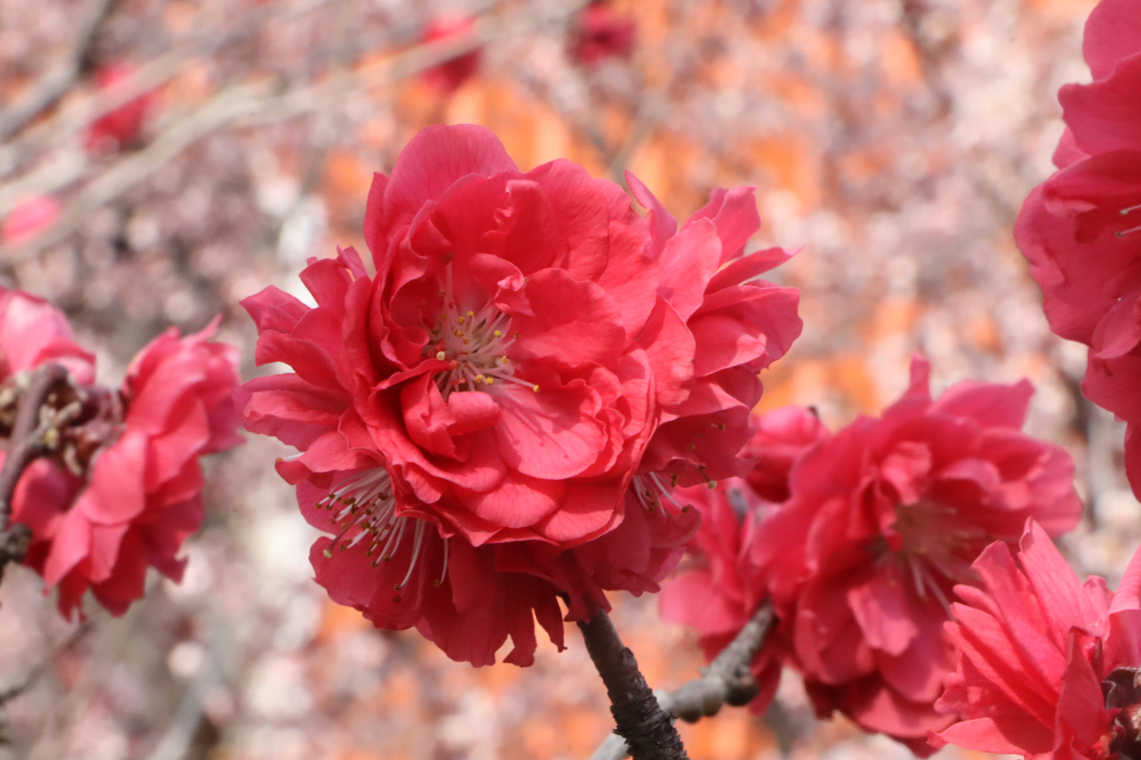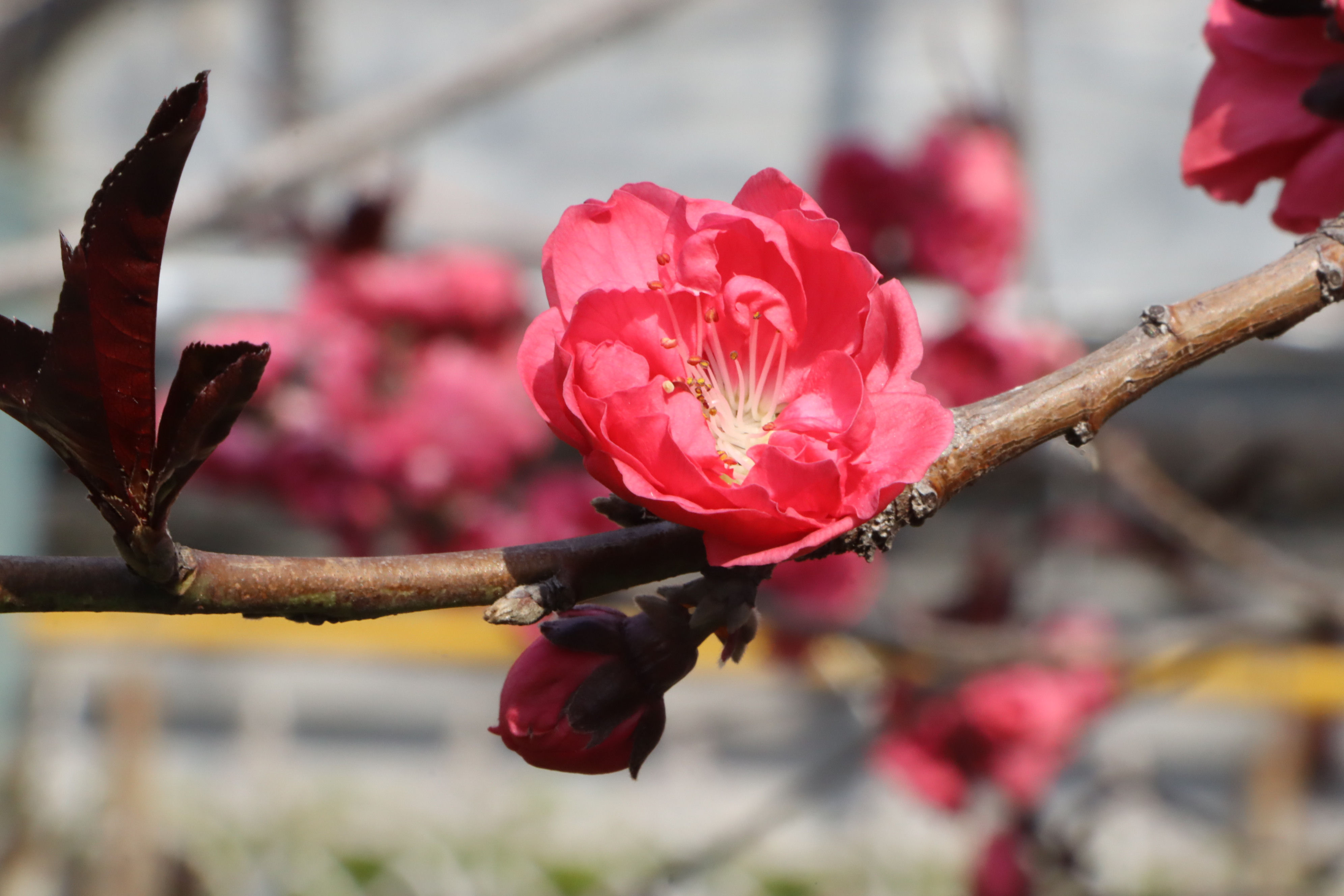 紫叶桃花:李亚科,桃属植物桃的变种,叶为窄椭圆形至披针形,花单生,从淡至深粉红或红色,有时为白色,有短柄,直径4厘米,早春开花。花语:爱情的俘虏