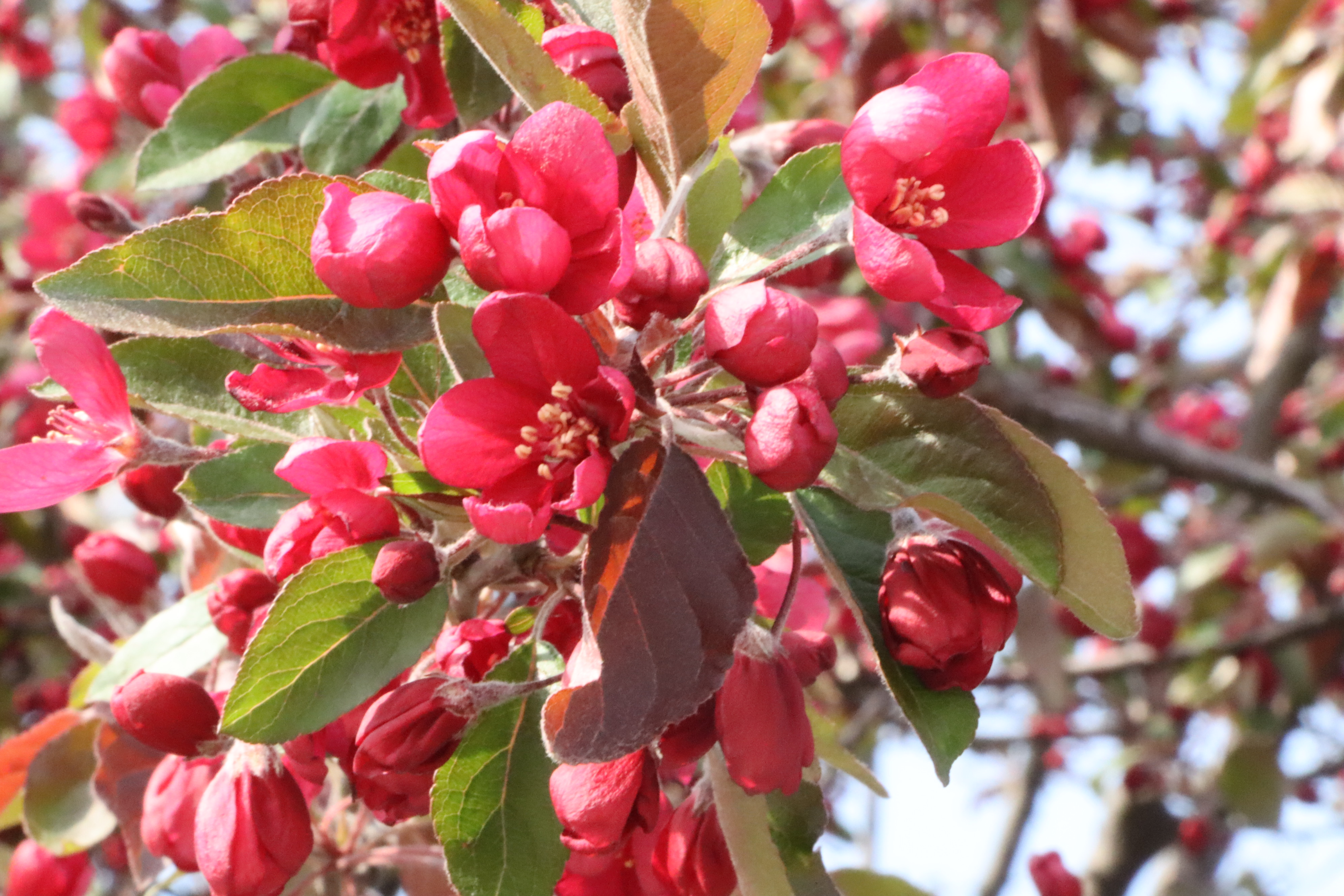 垂丝海棠:花色艳丽,花姿优美。花朵簇生于顶端,花瓣呈玫瑰红色,朵朵弯曲下垂,如遇微风飘飘荡荡,娇柔红艳。花语:游子思乡、离愁别绪