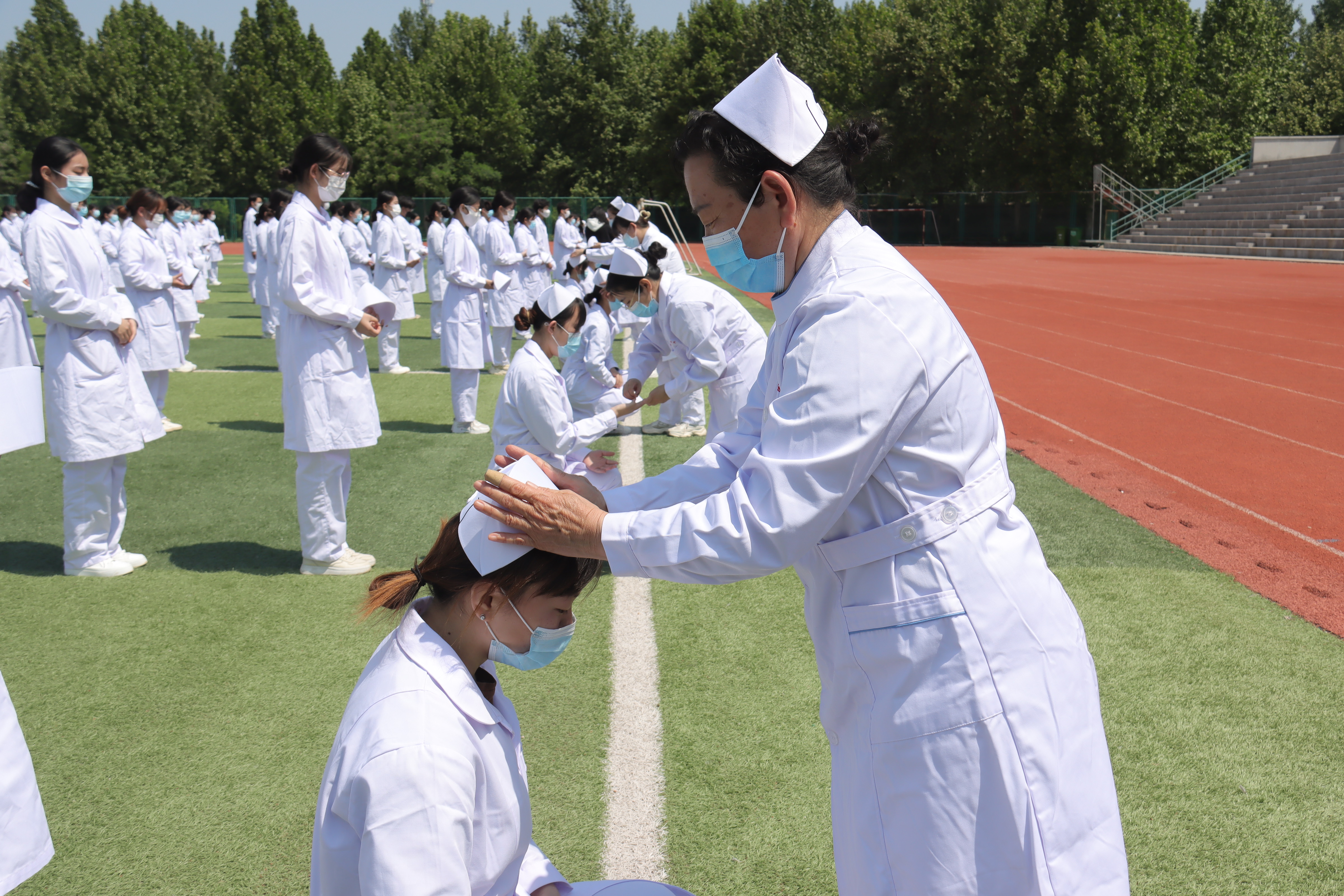 5月13日上午,学院医学护理学院2022年护士节授帽仪式在体育场举行。学院及主校区领导白庆丽、卢传升、张祖军,以及党办、院办、学生处、团委等部门负责人出席授帽仪式,2020级护理专业学生参加仪式。