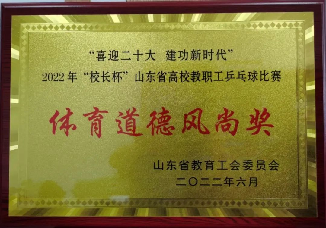 6月20日至24日,“喜迎二十大,建功新时代”2022年“校长杯”山东省高校教职工乒乓球比赛在山东体育学院日照校区举办,我院首次组队参赛,取得不俗战绩。学院党委副书记、青岛校区党总支书记姜波获得“校级领导组”男子单打比第五名,学院荣获山东省教育工会颁发的“体育道德风尚奖”。