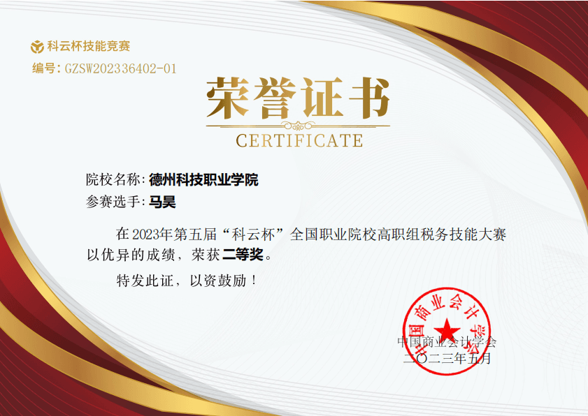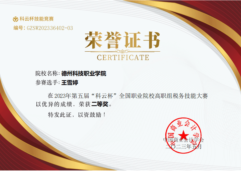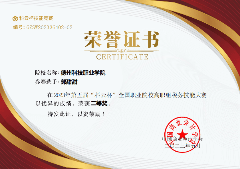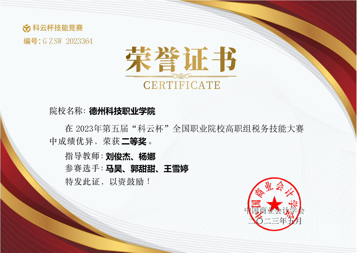 日前,由中国商业会计学会主办、中国商业会计学会职业教育分会协办,厦门科云信息科技有限公司承办的2023年“科云杯”全国职业院校中职组税务技能大赛圆满落幕。互联网数字经济学院的马昊、郭甜甜、王雪婷三名学子在大赛中成绩优异,荣获二等奖。