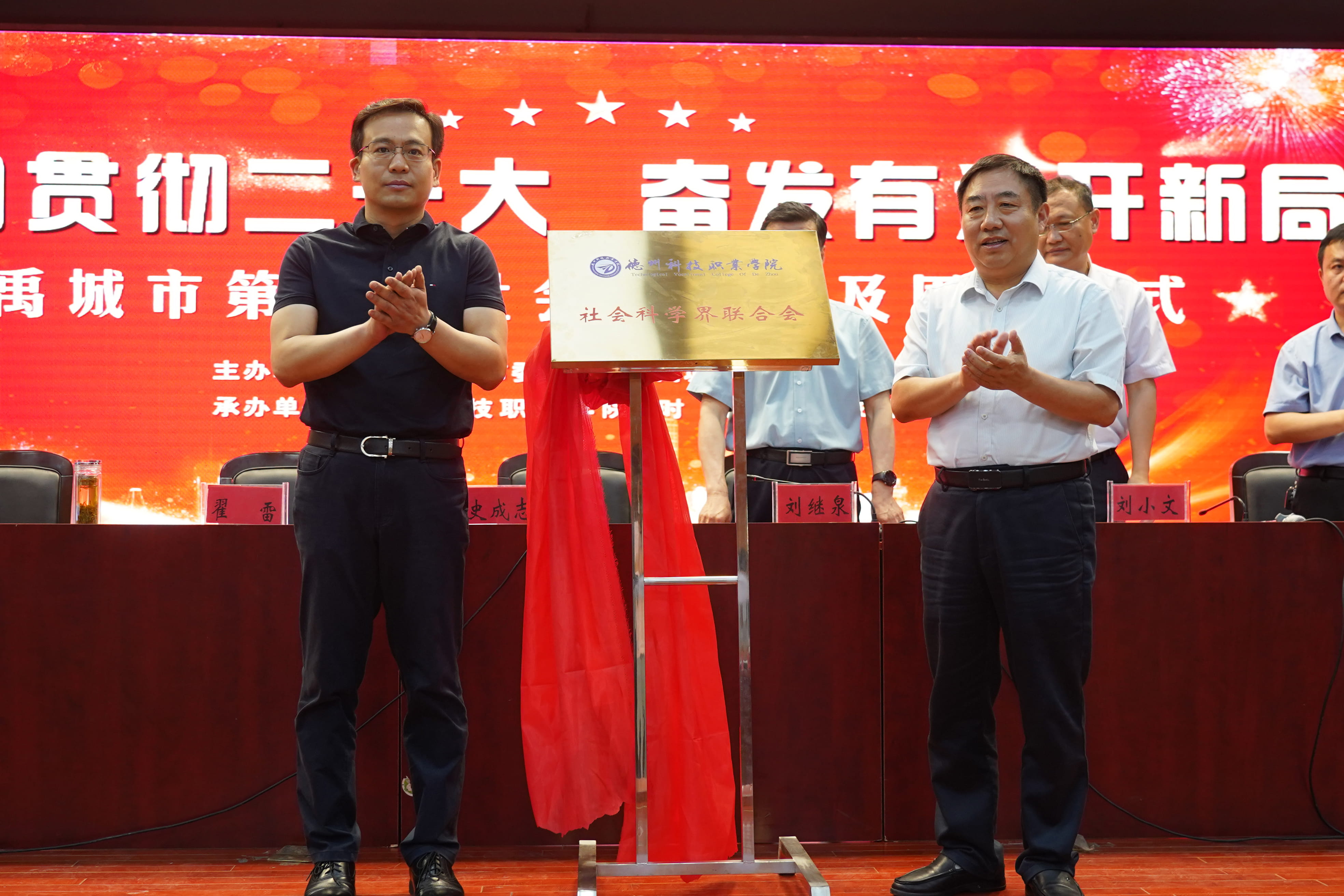 伴随着热烈、喜庆的音乐,史成志、翟雷共同为“德州科技职业学院社会科学界联合会”揭牌。