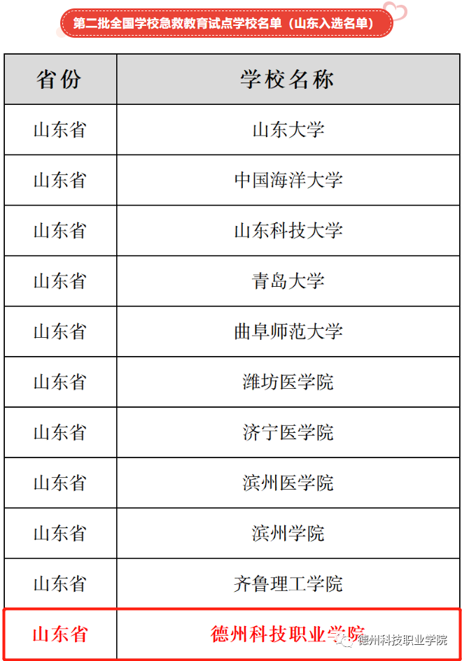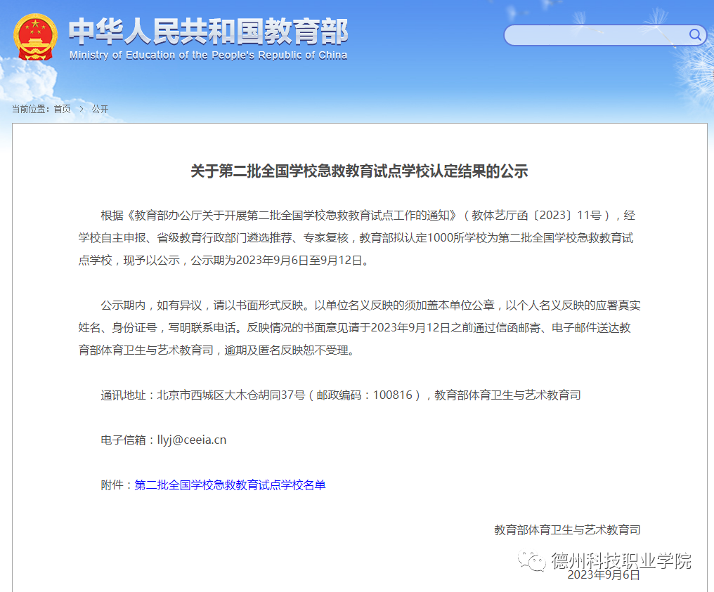 近日,教育部办公厅发布公示,拟认定1000所学校为第二批全国学校急救教育试点学校。经自主申报、省级教育行政部门审核推荐、教育部综合认定,学院入选为第二批全国学校急救教育试点学校。