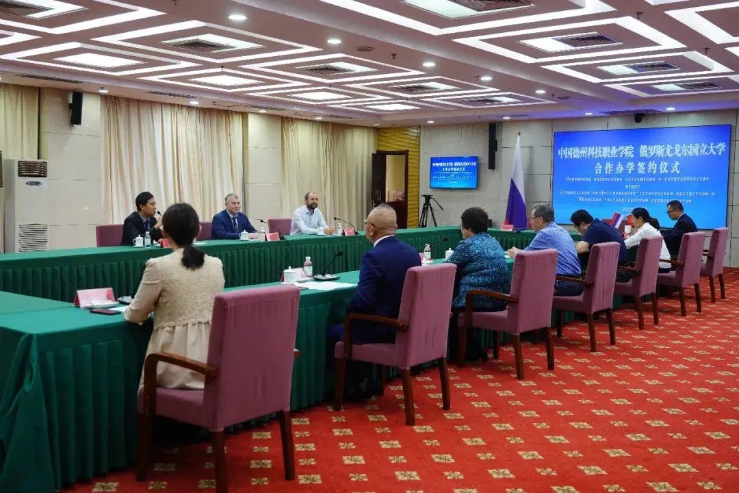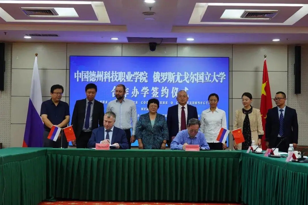 签约仪式上,朱国材、库钦·罗曼·维克托罗维奇分别介绍了两校发展历程、办学规模、学科建设、科研合作等方面的基本情况和办学成果。朱国材指出,学院自办学以来,坚持立德树人,深化产教融合,在国家级、省级各类大赛中取得了优异成绩。同时,学院积极推进国际交流与合作,致力在专业发展、人才培养等方面取得新提升。今年五月,学院与贵校举行了合作办学视频签约仪式,为国际化人才培养和优质教育资源引进提供了重要平台。此次的签约仪式,必将促进两校在人才培养、师生交流、科研合作等方面展开深入合作,让更多师生走出德科、走向世界,为培养国际化技能人才作出更多贡献。