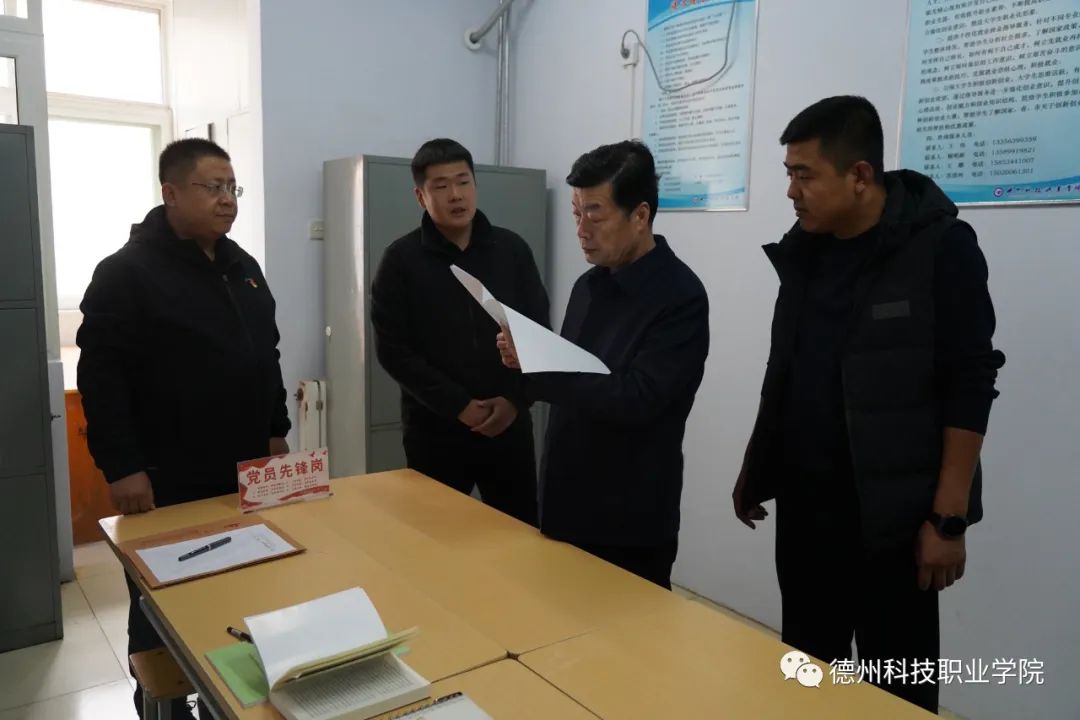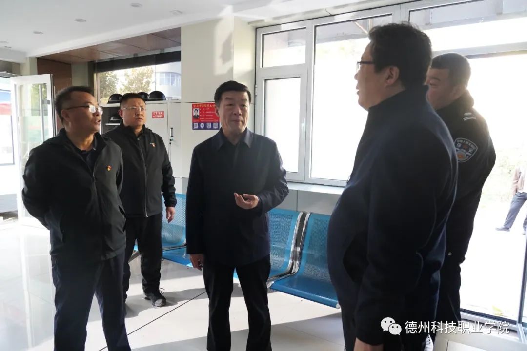 在校园警务室,安保处负责同志汇报了校园警务室的建设、警校联动、安防设施配备、人员管理、培训工作开展等情况。刘继泉现场查看了视频监控、安防器材、值班室配置等,强调要严格落实校园安全管理制度、应急处置预案和各项安全措施,确保人员持证上岗、安防器械配备齐全、“一键报警”装置正常使用,保障学院人防、物防、技防落实到位,确保校园安全稳定。