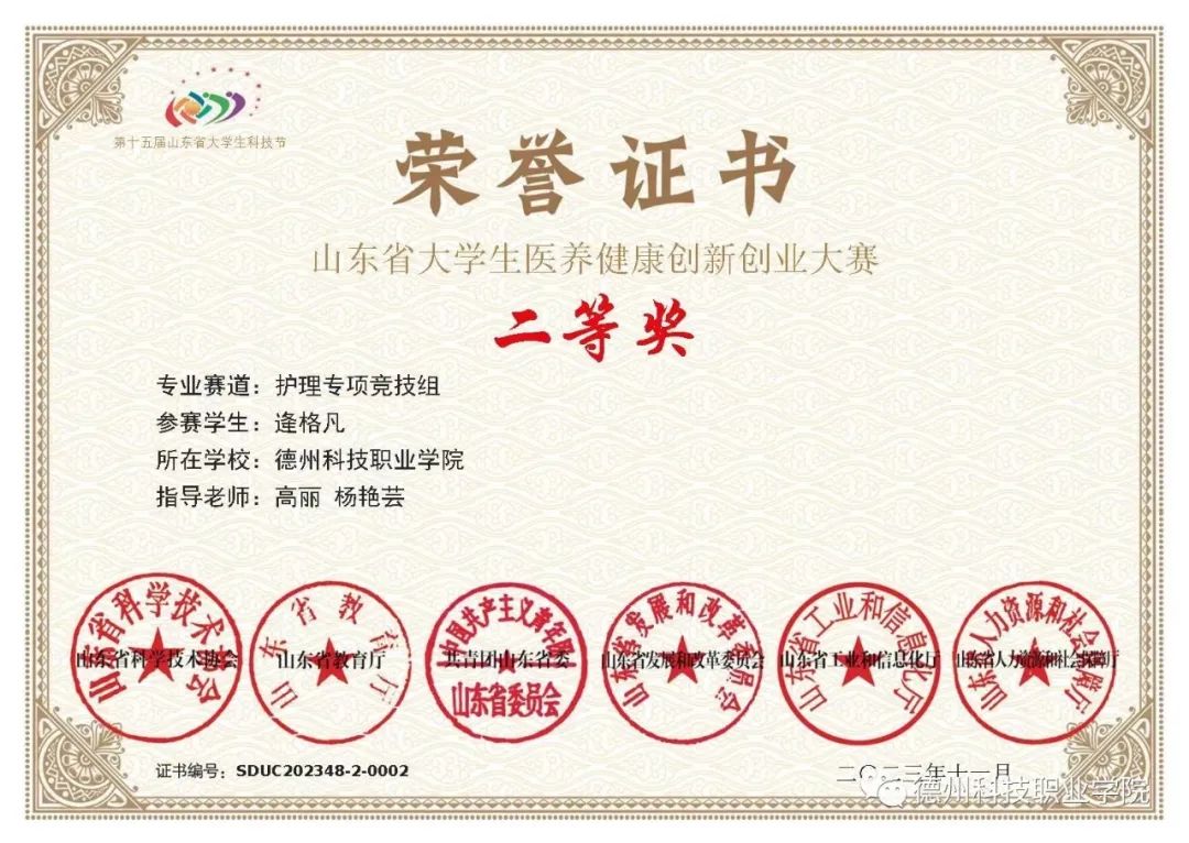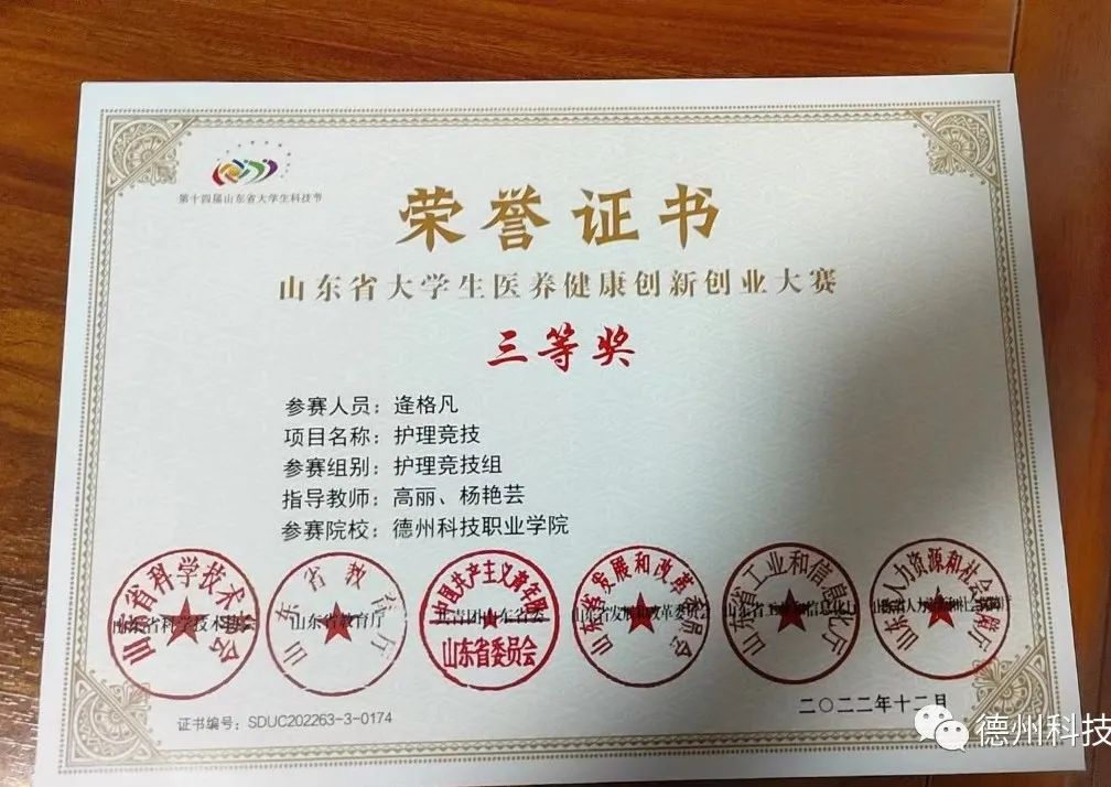 在校期间,发挥专业所学、提高技能水平,积极参加各类技能比赛,获2022年山东省大学生医养健康创新创业大赛护理专项竞技组三等奖、2023年山东省大学生医养健康创新创业大赛护理专项竞技组二等奖、第十六届山东省职业院校技能大赛护理技能赛项三等奖、校级心肺复苏一等奖等奖项。