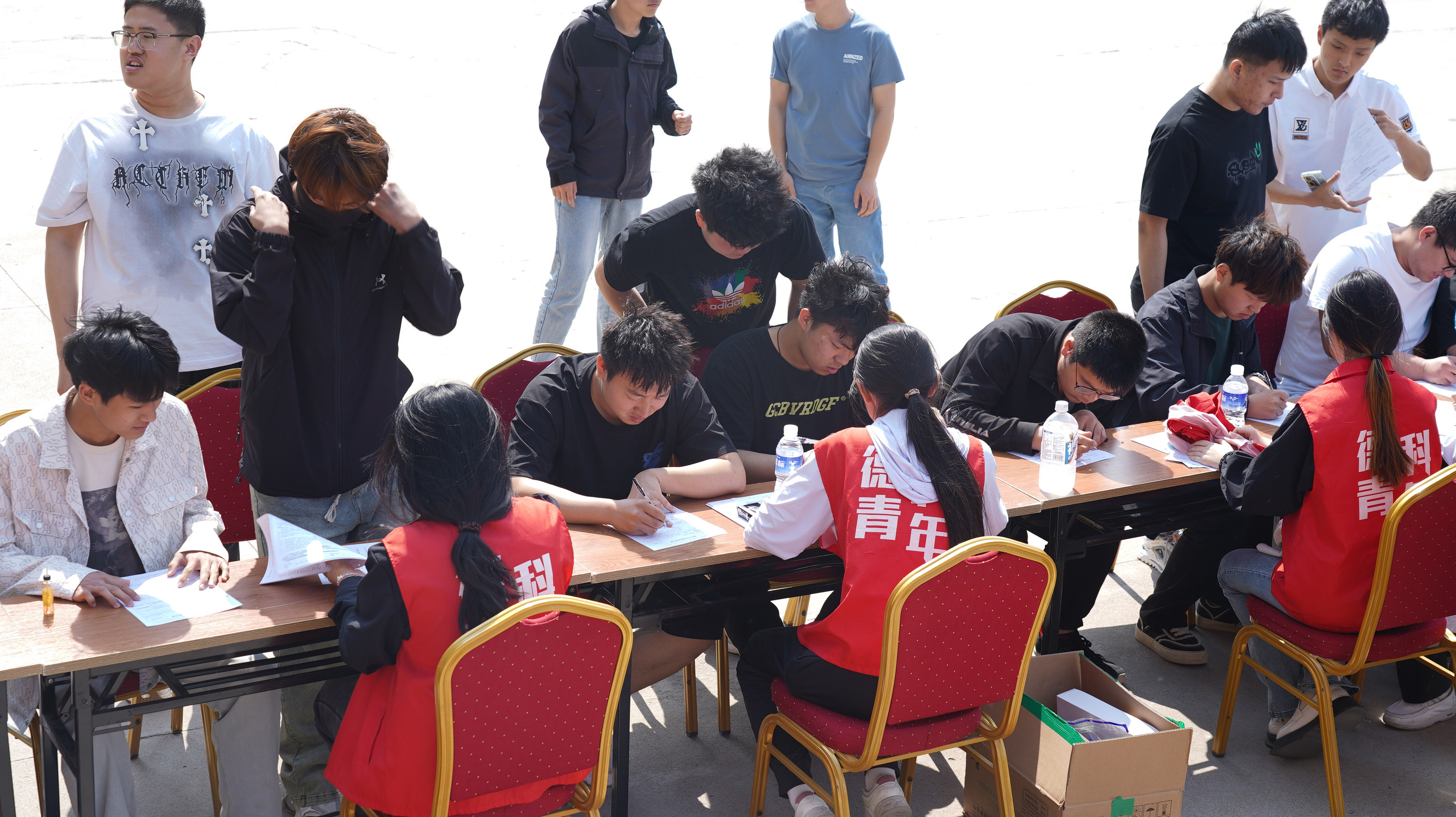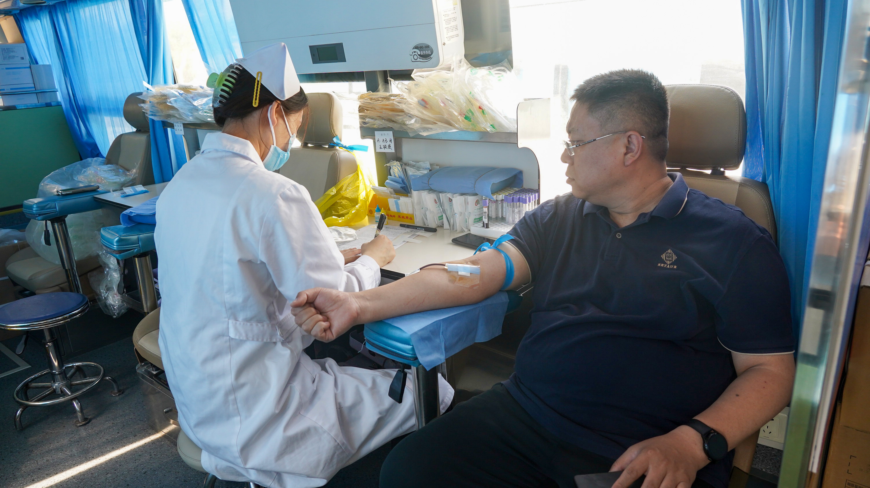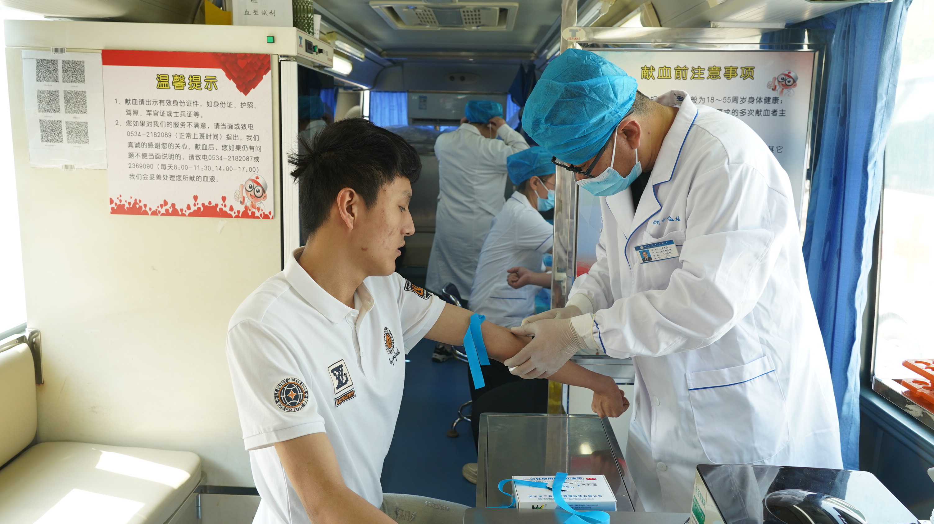采血过程中,师生们热情高涨,撸起袖子、伸出臂膀,积极配合工作人员进行血压检测、验血筛查、抽血等工作。医护工作人员时刻观察献血志愿者有无不良反应,给予献血志愿者情绪安抚和心理疏导,叮嘱相关注意事项,并为参与献血的师生发放爱心纪念礼品。