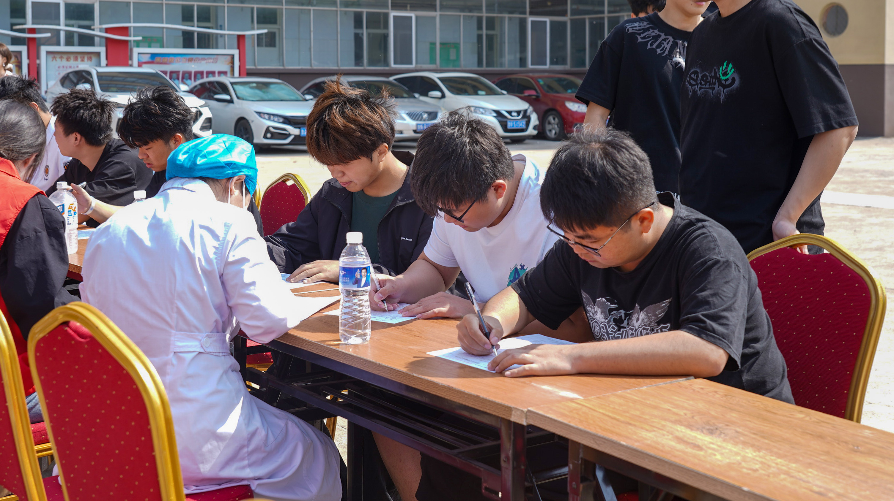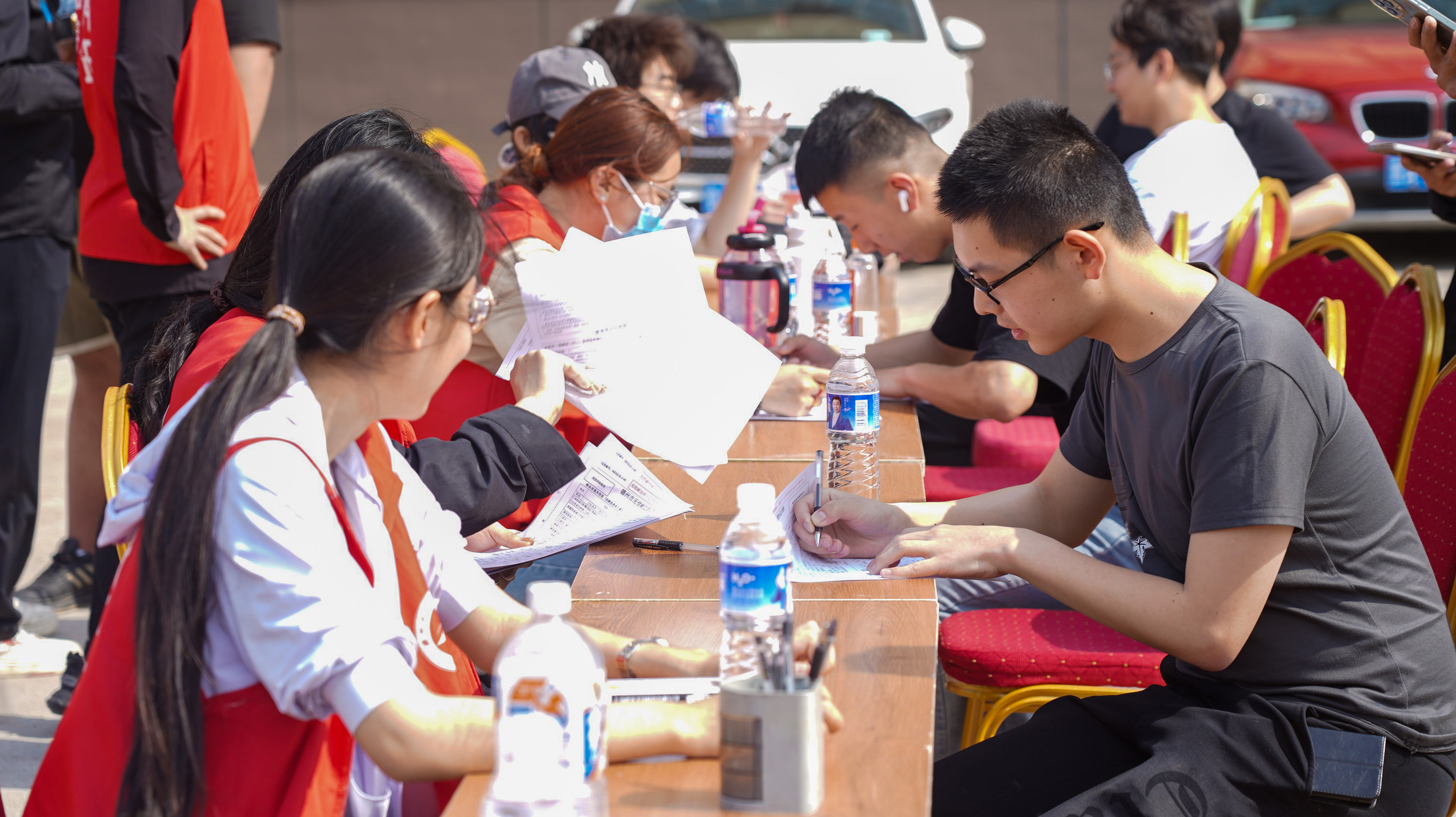 活动现场,4辆大型采血车停靠在主教学楼广场,参加无偿献血的师生早早地排起了长队。在青年志愿者和工作人员的协调、指导下,填表、核查信息、采血、检验......献血活动井然有序的进行着。