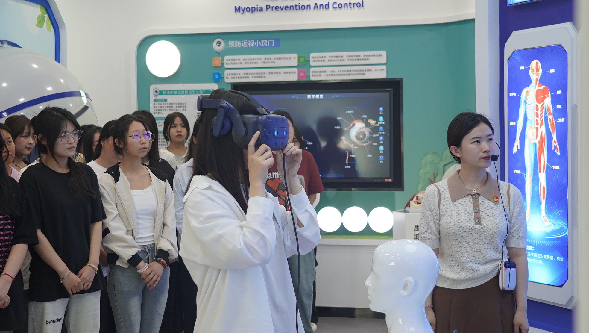 参观过程中,在场学生亲身参与、积极互动,佩戴AR设备体验在虚拟的血管世界遨游、按压打火机直观感受吸烟入肺过程、现场参与心脏复苏等应急救护操作要领的训练等,通过馆内丰富多样的设备、趣味十足的互动环节,让学生们更加生动地了解到人体结构、生理功能、常见疾病等多方面知识,深切体验生命之旅,感受生命科学魅力。