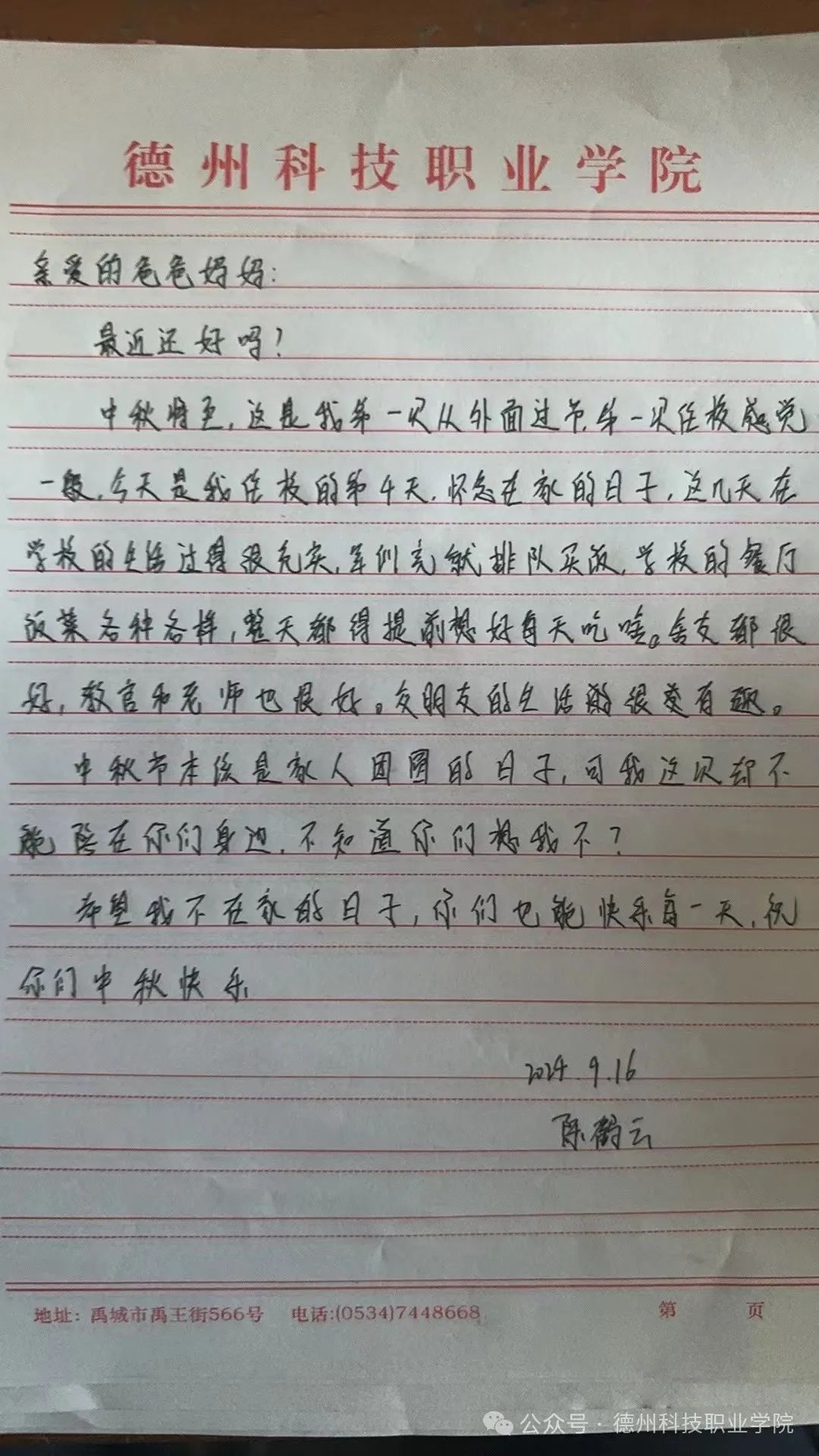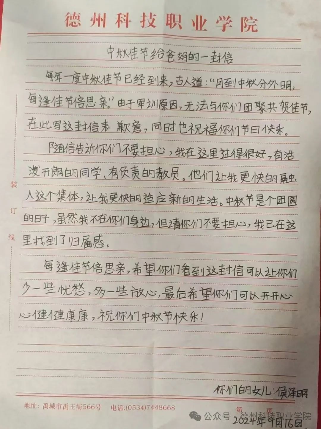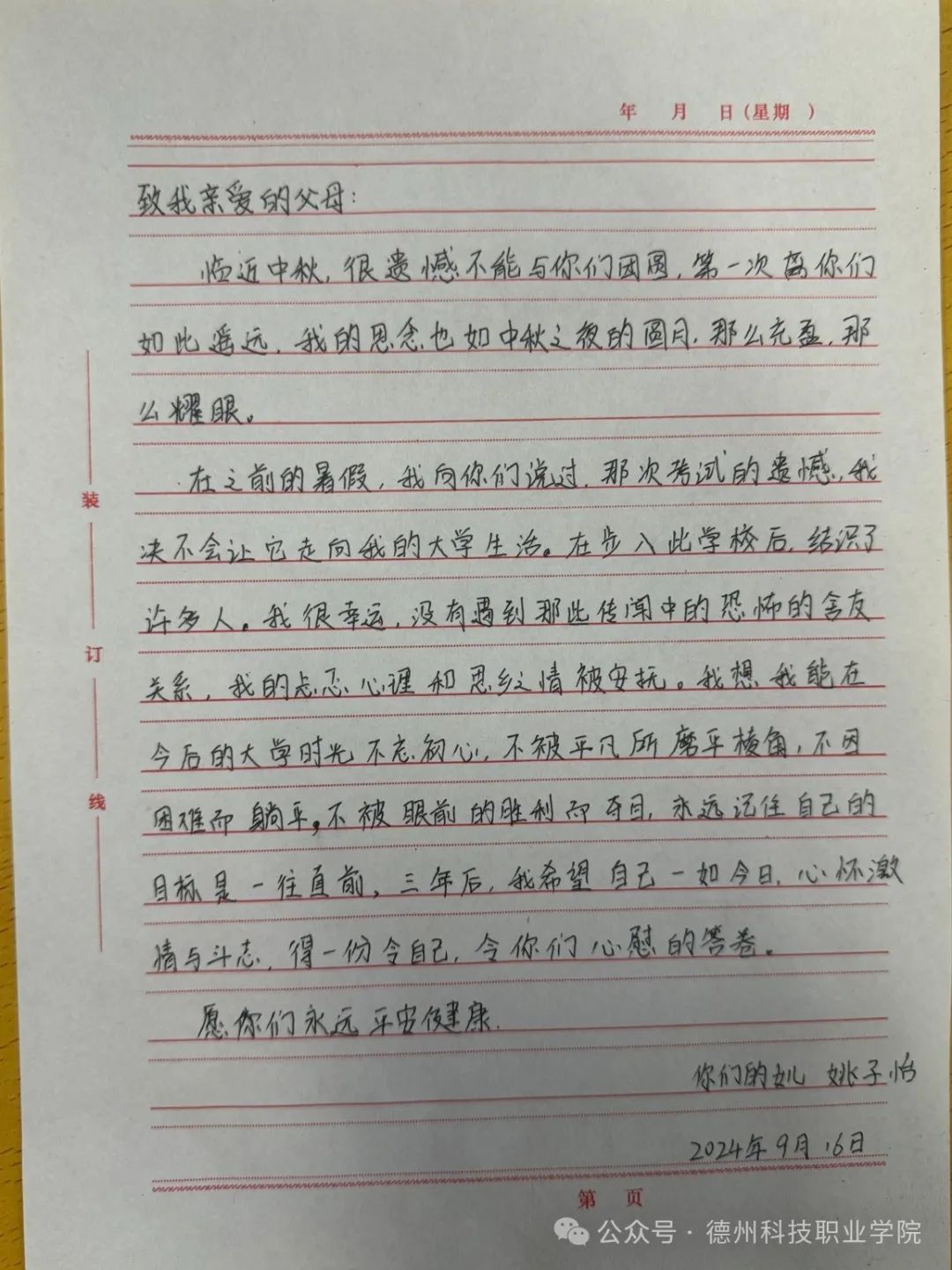 学校举办中秋节一封家书活动,感受到学校用心至极,让我与父母爱的距离又进了一步,他们收到家书之后,没想到我这么含蓄的一个女孩会这么勇敢的表达心中的爱意和情绪。让我感受到沐浴在父母的爱意之下,是无比幸福的事情。