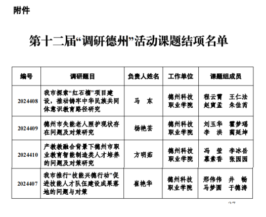 近日,中共德州市委宣传部、德州市社会科学界联合会发布了《关于公布第十二届“调研德州”活动课题结项名单的通知》(德社科联字〔2024〕15号)文件,我校4项课题顺利结项。