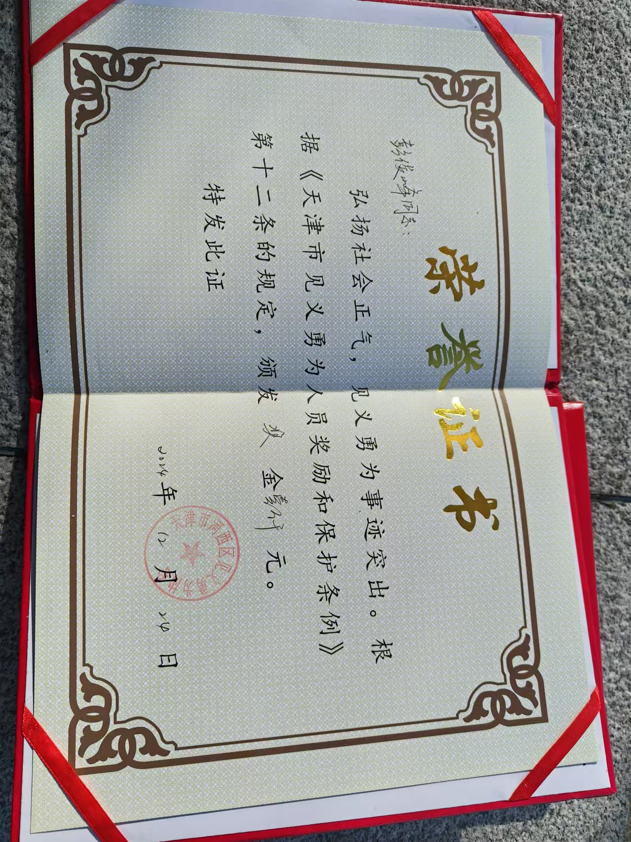 我校学生彭俊峰获天津市见义勇为证书
