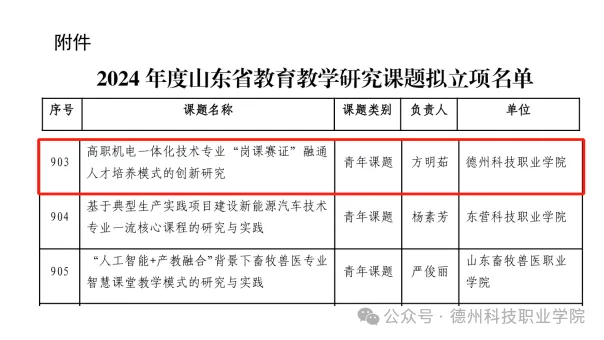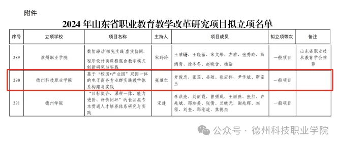 近日,山东省教育厅、山东省教育科学研究院相继公布了《2024年度山东省教育教学研究课题立项名单》和《2024年山东省职业教育教学改革研究项目立项名单》,学校教师方明茹、张继红分别主持的课题《高职机电一体化技术专业“岗课赛证”融通人才培养模式的创新研究》、《基于“校园+产业园”双园一体的电子商务专业群实践教学体系构建与实践》成功获批省级课题立项,在教学科研项目中取得新的突破。