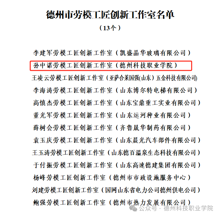 日前,德州市总工会下发《关于公布2024年度全市全员创新竞赛突出集体和个人的通知》,我校“孙中诺劳模工匠创新工作室”正式获评“德州市劳模工匠创新工作室”称号。