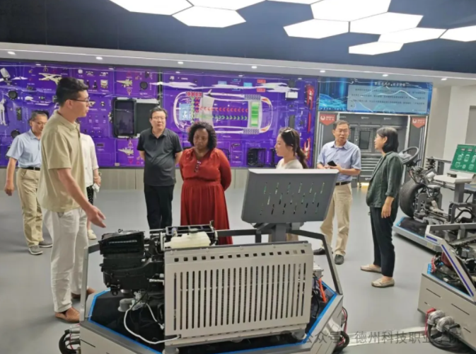 考察期间,代表团一行重点参观了学校新能源混动实训室,近距离观摩、沉浸式体验先进的实训设备与教学场景,深入与实训室负责人交流,听取实训室的管理使用、实习实训、建设运行等情况汇报,了解在新能源汽车领域的专业优势,对学校产教融合、赛教融通、教学创新等现代职教理念与具体实践给予了高度的评价。
