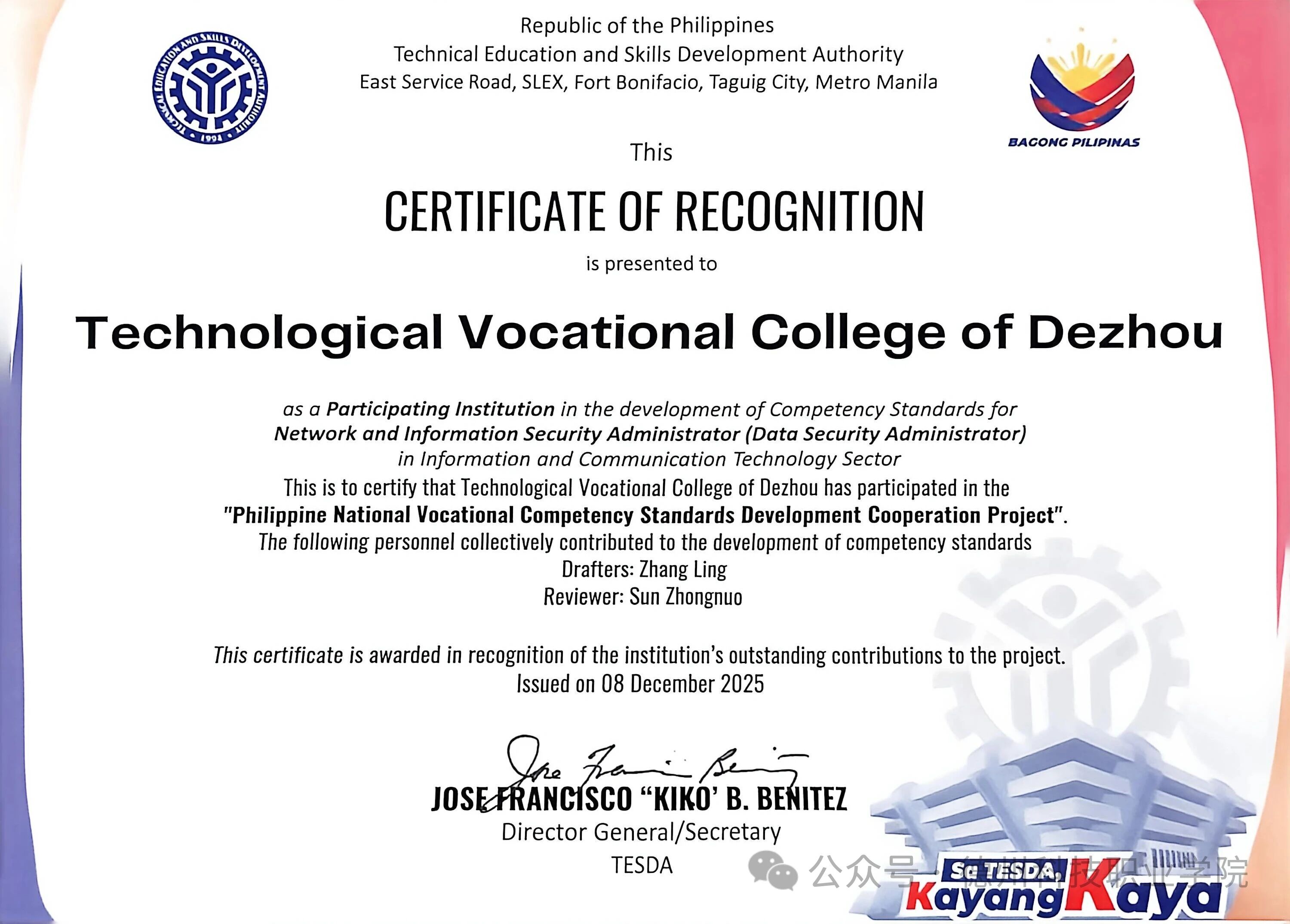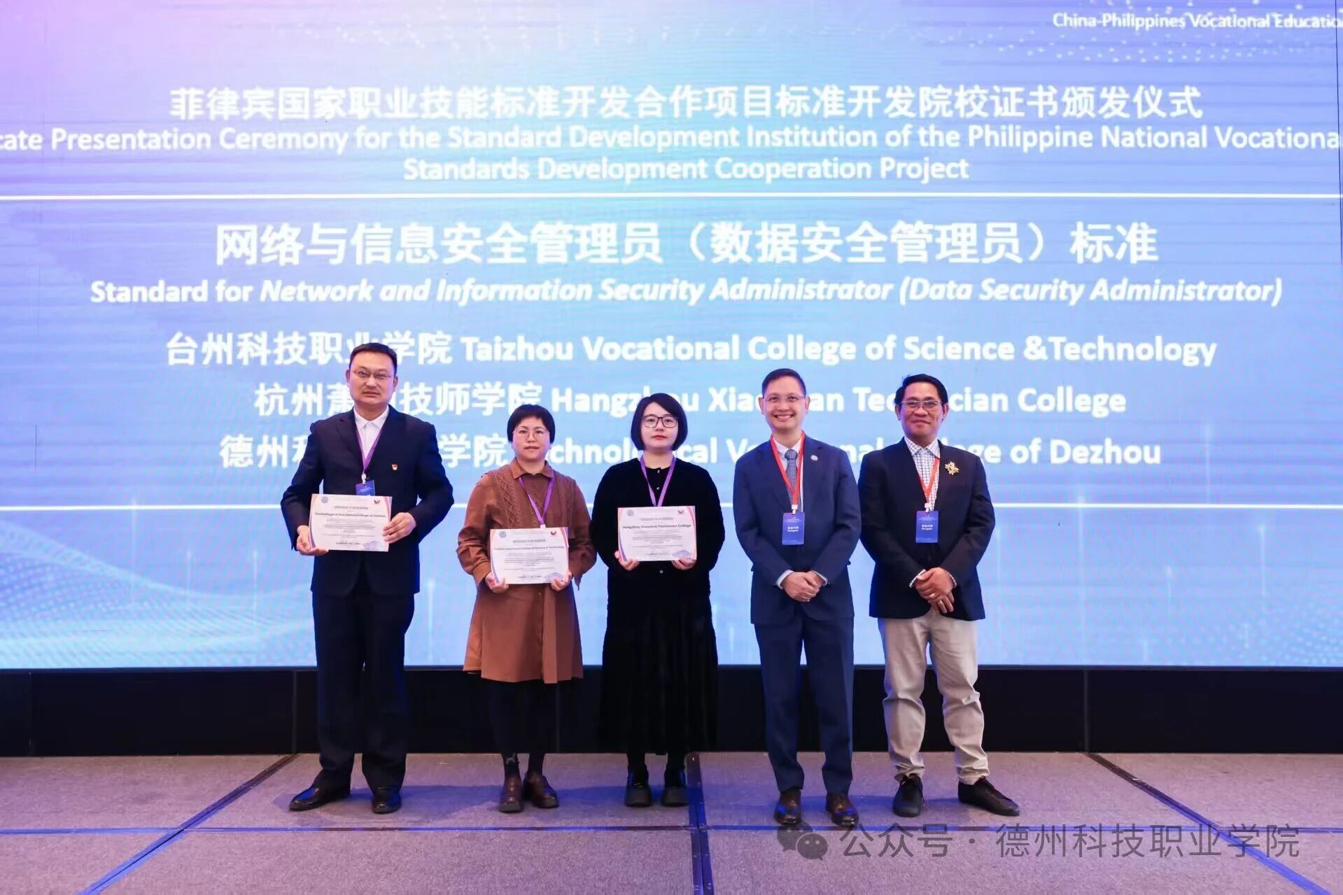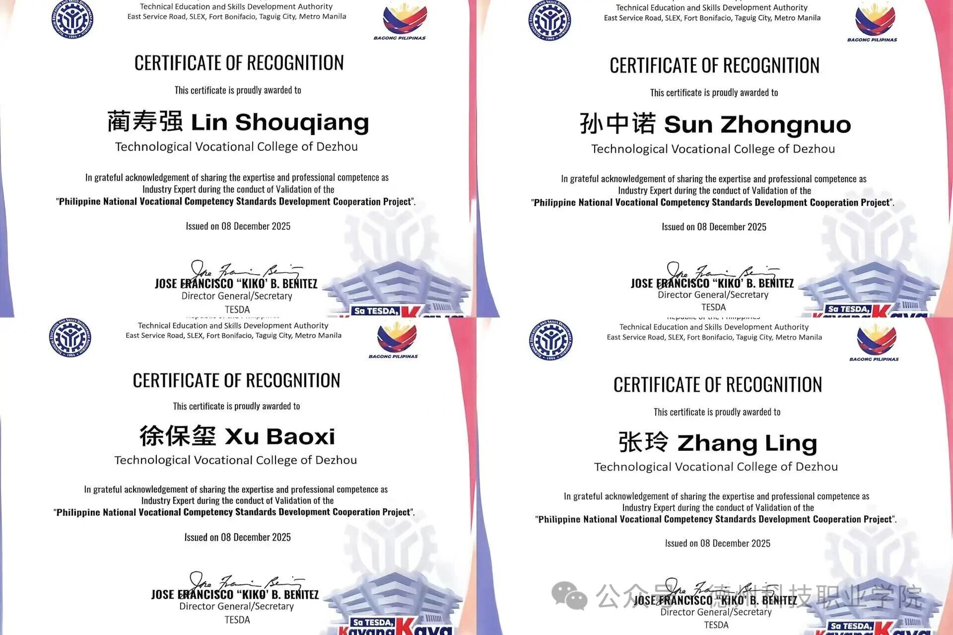 项目成果获得菲律宾职业技术教育与技能发展署官方充分肯定与高度认可,学校成功荣获“菲律宾国家职业技能标准开发单位”,张玲、蔺寿强两位教师获颁标准“起草人”技术专家认证,孙中诺、徐保玺两位教师获颁标准“审定人”技术专家认证。