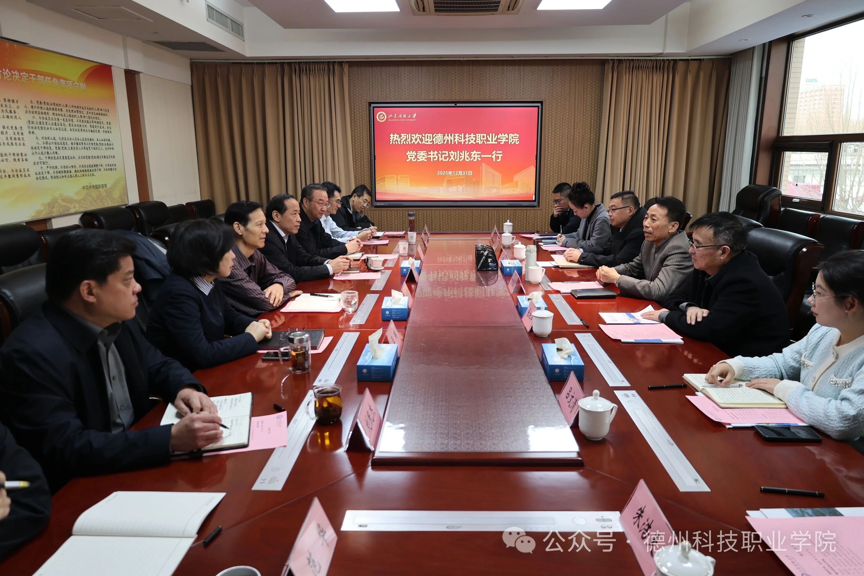 在山东开放大学会议室,党委书记徐文谋,党委副书记、校长司家军,党委副书记王瑛,向刘兆东一行表示热烈欢迎,并介绍了山东开放大学办学基本情况,总结了近年来在开展学历与非学历教育方面取得成绩,以及在开展社区服务、成人教育、老年教育等方面的特色和优势。徐文谋表示,将进一步加强与德州科技职业学院在党建对口帮扶、校园文化建设、服务社会发展等方面的支持与合作,充分发挥校校优势,互利共赢、服务发展、培养人才。