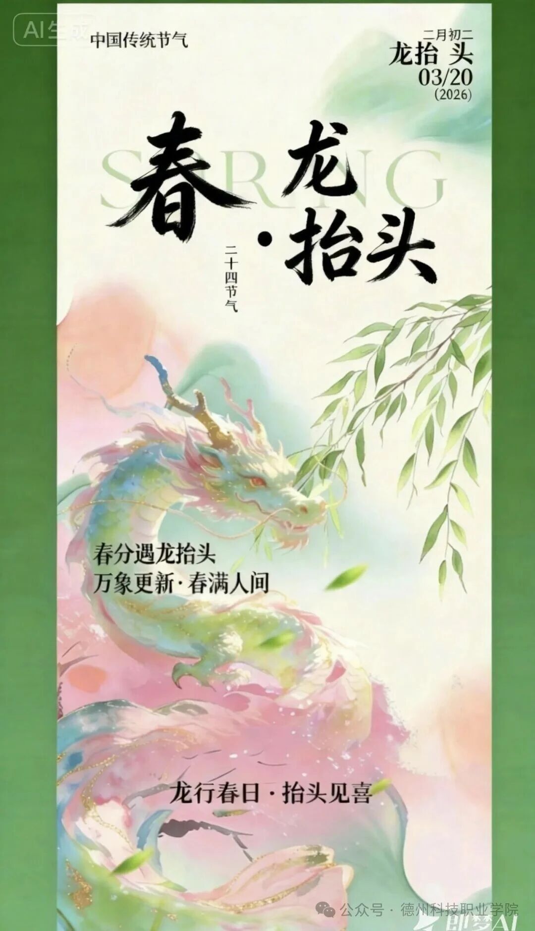 春来潮涌东风劲,扬帆奋进正当时。二月二,龙抬头,愿每一位德科人都能乘着春风,心怀热爱,脚踏实地,以昂首向上的精气神,在求学之路、育人之途、发展之路上勇攀高峰,收获成长;愿德州科技职业学院在新的一年里,龙骧虎步,蒸蒸日上,在高质量发展的征程上再谱新章,再创辉煌!