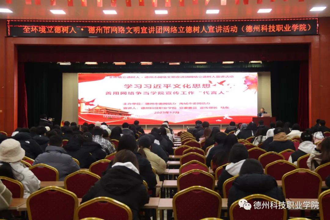 为深入推进网络文明建设,引导广大师生践行网络文明规范,提升网络文明素养,12月20日,由德州市委网信办、禹城市委网信办主办的德州市网络文明宣讲团网络立德树人宣讲活动在学院大禹大讲堂举行。学院党委委员、宣传部长、统战部长,思政课教学部主任马东以《学习习近平文化思想 善用网络争当学院宣传工作“代言人”》为主题,为大学生开展宣讲教育。