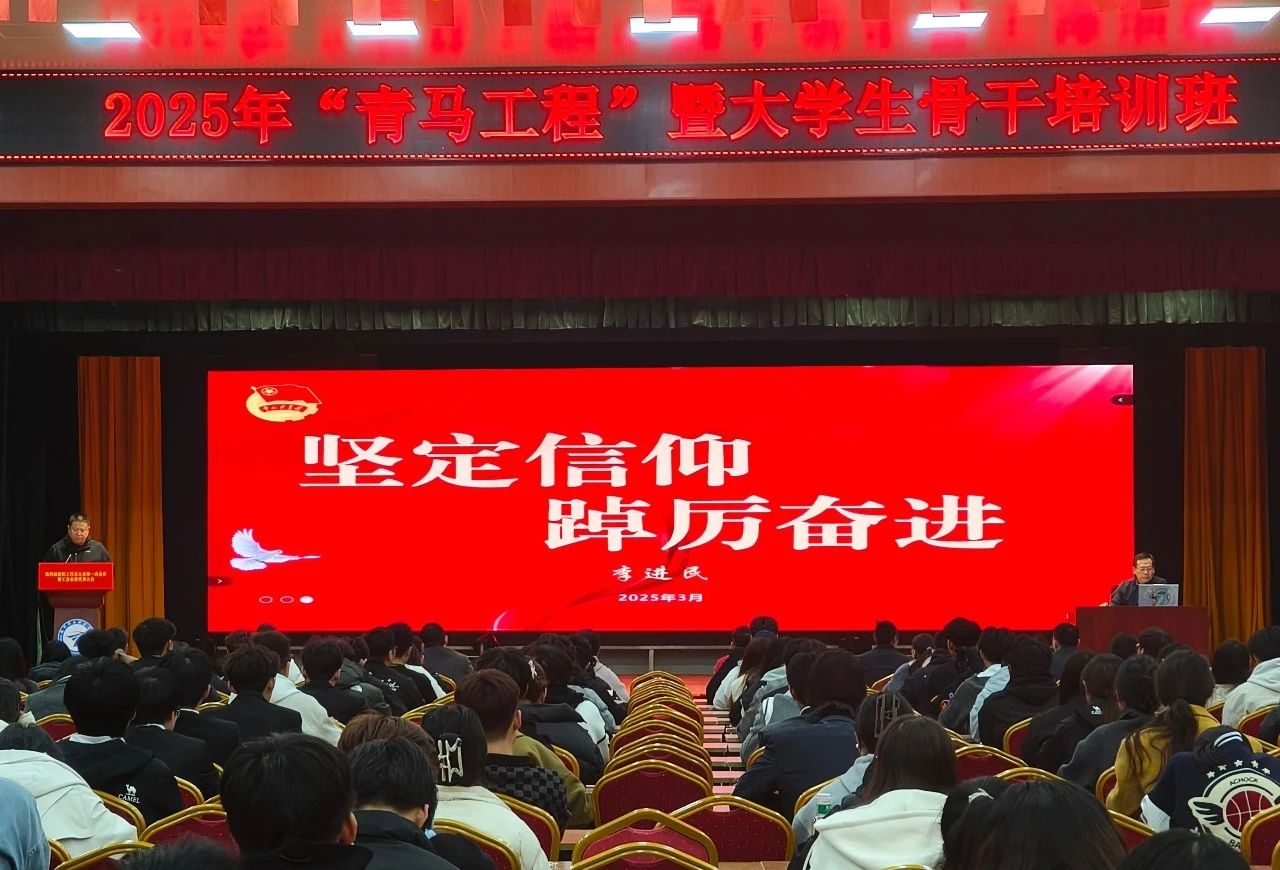 为深入学习贯彻习近平新时代中国特色社会主义思想,全面贯彻落实党的二十大和二十届三中全会精神,认真贯彻落实习近平总书记关于青年工作的重要思想,深入实施青年马克思主义者培养工程,进一步加强青年学生的政治素养、理论水平和实践能力,3月28日下午,校团委在图书馆三楼大礼堂开展“青年马克思主义者培养工程”暨大学生骨干培训班理论学习。学校党委委员、副校长李进民以“坚定信仰 踔厉奋进”为主题进行授课,校团委书记兼学团工作部副部长刘艺博主持培训班。