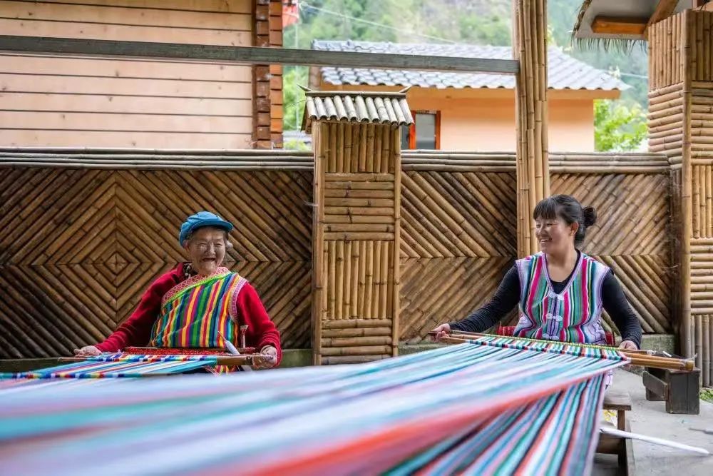 云南怒江贡山县独龙江乡独龙族老人李文仕(左)和女儿在编织独龙毯