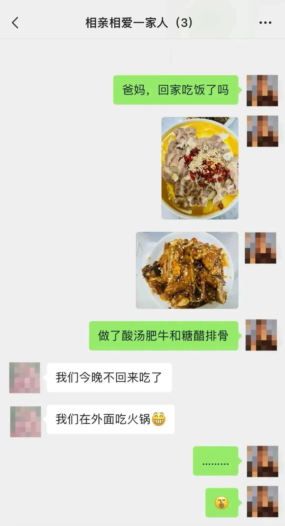 以前每到放假回家,爸爸总是起很早去菜市给我买喜欢吃的羊排、牛腩、排骨。但我似乎经常因为各种理由不回家吃饭,那个时候,他们看着手机里面发来的短信,说“今晚不回家吃饭”,是不是也这样的失落无奈呢?