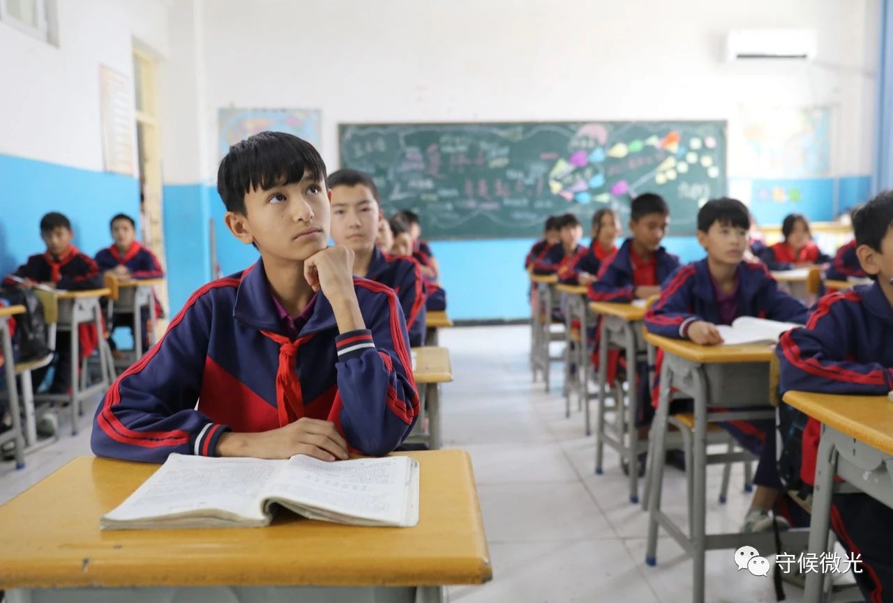8月25日,新疆维吾尔自治区和田地区,和田县塔瓦库勒乡巴克墩村小学,六年级(1)班的阿卜杜热·扎克·合力力和同学们在课堂上听语文老师武申奥讲课。中青报·中青网记者 陈剑/摄